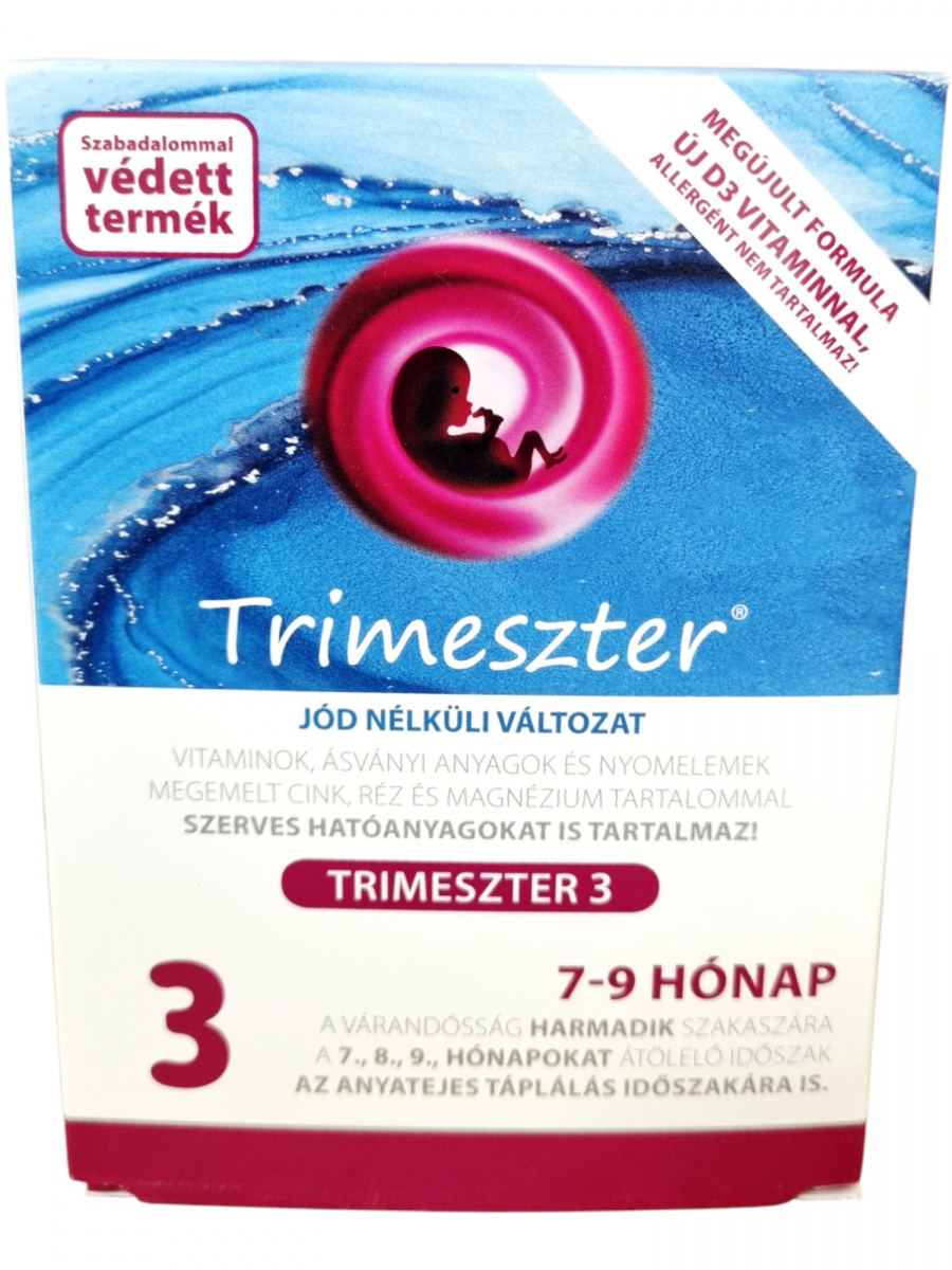 A Trimeszter 3 jódmentes várandósvitamin a terhesség utolsó trimeszterére (7–9. hónap) készült. Megemelt cink-, réz- és magnéziumtartalmával segíthet a kismama és a magzat igényeinek kielégítésében. A készítmény hozzájárulhat az immunrendszer, a csontozat és az izmok normál működéséhez, valamint a fáradtság és kifáradás csökkentéséhez. A folsav támogatja a normál vérképződést és a sejtosztódást, a vas és a réz pedig a normál vörösvérsejt- és hemoglobinképződést. A termék szabadalmaztatott formula, allergén- és színezékmentes, így kifejezetten biztonságos választás a várandósság harmadik szakaszára, valamint az anyatejes táplálás időszakára is ajánlott.
