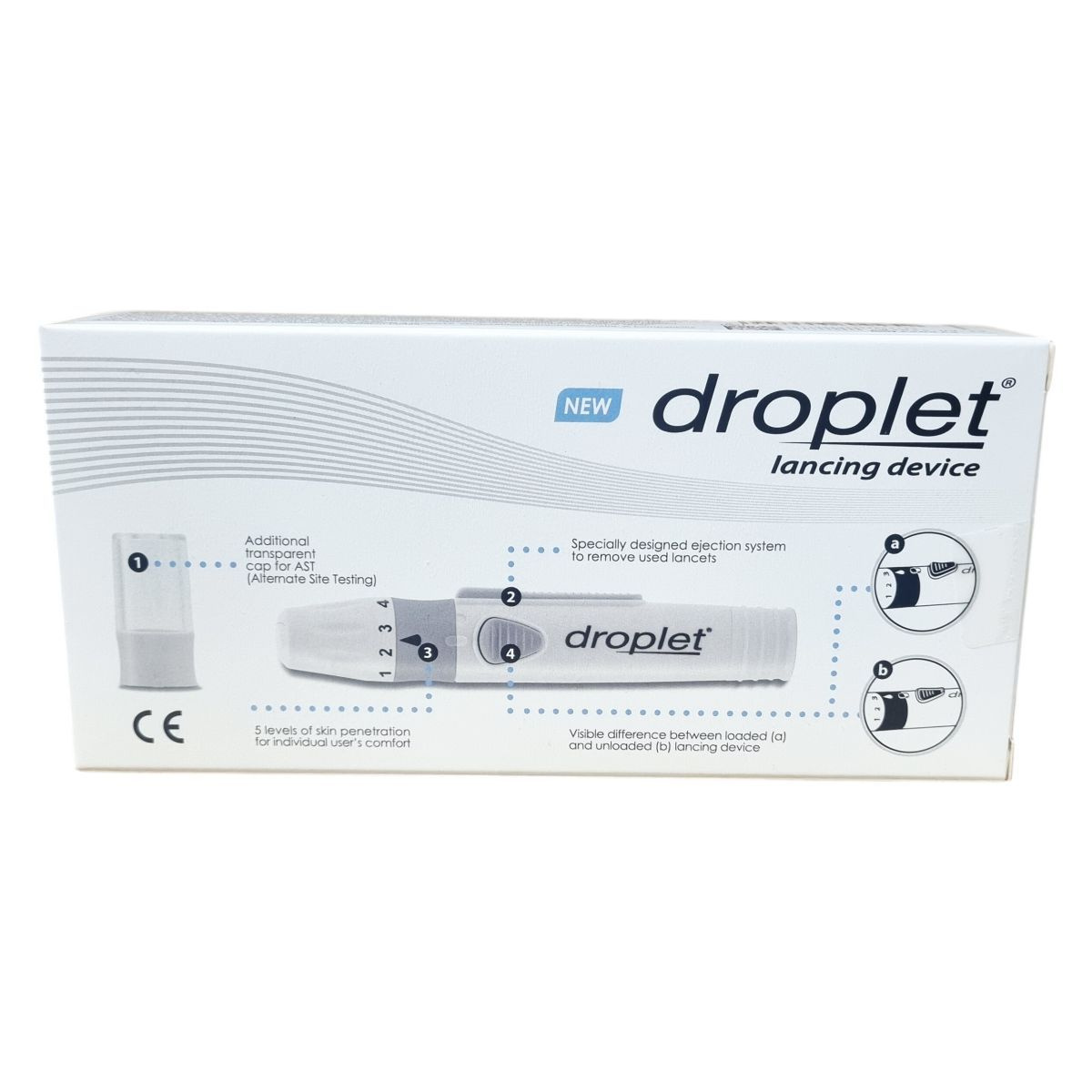 A droplet® lándzsás vérvételi eszköz orvostechnikai eszköz, amely steril, egyszer használatos lándzsákkal alkalmazható kapilláris vérmintavételhez. Többször használható készülék, amelyet nem egészségügyi végzettségű felhasználók számára terveztek. Kiegészítő átlátszó kupakkal rendelkezik alternatív mintavételi helyekhez (AST). Speciálisan kialakított kilökő rendszerrel segíti a használt lándzsák eltávolítását. Öt különböző szúrásmélységi szint állítható be a felhasználó kényelmének érdekében. Látható különbség jelzi a felhúzott (a) és a nem felhúzott (b) állapotot. REF: 9396. UDI: (01)05903999609252, (11)250929, (10)2509AW. LOT: 2509AW. Származási hely: Lengyelország. Orvostechnikai eszköz (MD).