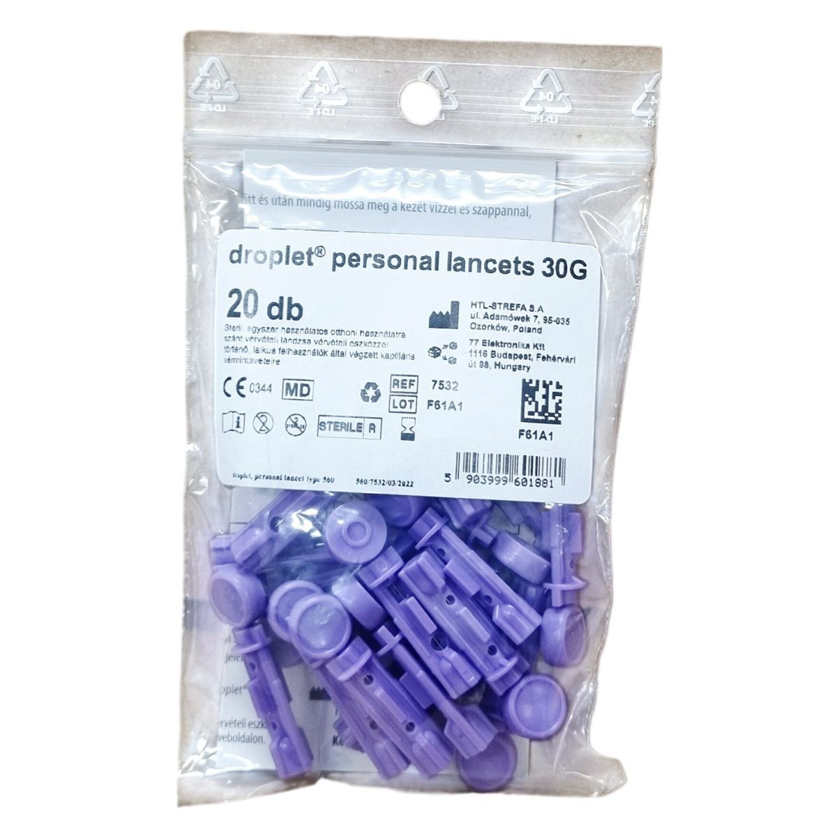 A droplet® personal lancets 30G steril, egyszer használatos vérvételi lándzsa, amely otthoni kapilláris vérvételhez készült laikus felhasználók részére. A lándzsák használata kizárólag egyszeri és egyéni, a fertőzések elkerülése érdekében minden használat előtt és után alapos kézmosás javasolt. A termék kompatibilis a droplet® vérvételi eszközzel, melynek használati útmutatóját követni kell. A lándzsák használatát az egészségügyi szakemberek utasításainak megfelelően kell végezni, a lándzsát használat után a helyi előírások szerint kell ártalmatlanítani. Védőkupak nélküli vagy sérült lándzsát nem szabad használni. Súlyos esemény esetén a jelentés kötelező. Gyártója a HTL-STREFA S.A. Lengyelországban készült termék.