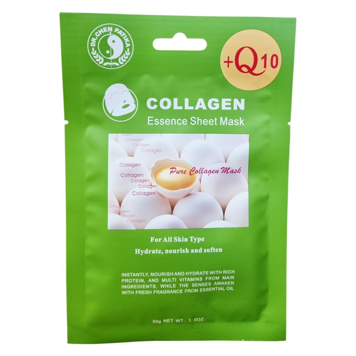 A Dr.Chen Patika +Q10 Collagen Essence Sheet Mask egy korszerű kutatási eljárással készült, különleges összetevőkkel átitatott szövetfátyol arcmaszk, amely segíti eltávolítani az elhalt hámsejteket és tisztán tartja a bőrfelszínt. Az arcot mélyen hidratálja, feltölti a sejteket nedvességgel, ezáltal az apró ráncok kisimulnak. Intenzív és egyedülálló programja hozzájárul a bőr regenerálásához, feszessé és puhábbá teszi a bőrt. Rendszeres használata mellett az arc természetes ragyogását őrzi meg. A kollagén a bőr szerkezetének fontos eleme, amelynek pótlásával biztosítja a hidratáltságot és üdeséget. A termék Kínában készül, és minden bőrtípusra alkalmas.