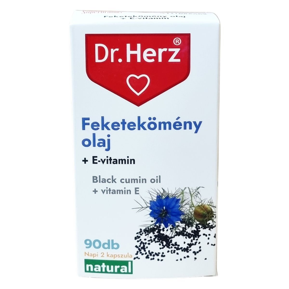 A Dr.Herz Feketekömény olaj + E-vitamin kapszula egy természetes étrend-kiegészítő, amely Egyiptomi feketeköménymag olajat (Nigella sativa) és E-vitamint tartalmaz. A terméket napi két kapszula fogyasztására javasolják főétkezések előtt, bőséges folyadékkal, szétrágás nélkül. A termék fő hatóanyagai a feketeköményolaj és az E-vitamin, amelyeket a szervezet általános támogatására használhatnak. Kizárólag természetes összetevőkből készül, és gondosan előállított kapszulában kerül forgalomba. A termék csak gyógyszertárakban és gyógynövényboltokban érhető el, ahol a Dr.Herz további vitaminokat, étrend-kiegészítőket, illóolajokat és gyógynövényes krémeket is kínál különféle egészségügyi területekre, mint az immunerősítés, anyagcsere, szív- és érrendszer, valamint haj, bőr és köröm ápolása. A termék tárolása szobahőmérsékleten, fénytől és nedvességtől védett helyen ajánlott. Az ajánlott napi adagot nem szabad túllépni, és a termék nem helyettesíti a kiegyensúlyozott étrendet és az egészséges életmódot.