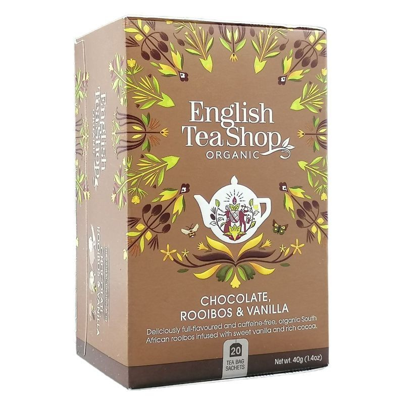 Összetevők: rooibos,* vanilia rúd,* csokoládé darabok,* természetes csokoládé és vanilia ízesítéssel. *Összetevők: Ellenőrzött ökológiai gazdálkodásból. Gyártó: The English Tea Shop Ltd. London, Anglia. Csomagolva: Sri Lanka. Tárolás: Hűvös száraz helyen. Minőségét megőrzi: lásd a doboz alján.