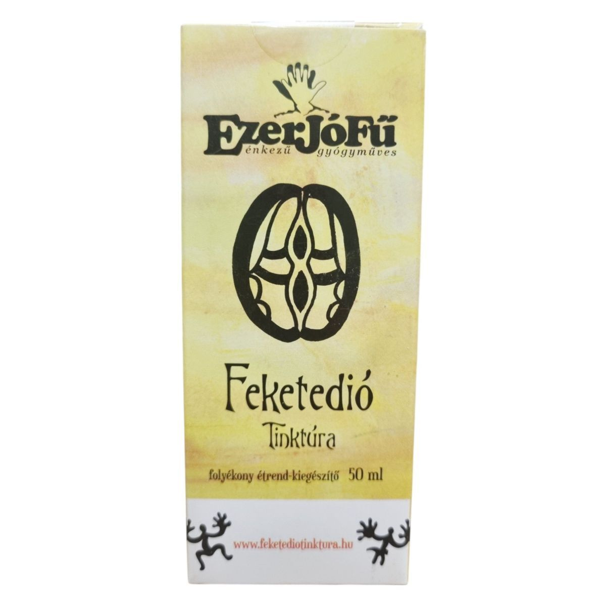 Az EzerJóFű Feketedió Tinktúra egy természetes alapanyagokból készült étrend-kiegészítő, amely a feketedió terméshéjának kivonatát tartalmazza. Az EzerJóFű Gyógynövény Kft. termékei a természetes egyensúly fenntartására törekednek, és a Göcsej régió tiszta környezetéből származó bio alapanyagokból készülnek. A tinktúra alkoholtartalma 36 V/V %, ezért alkalmazása nem javasolt alkoholbetegeknek, terhes és szoptató nőknek, valamint gyermekeknek. A termék fogyasztása nem helyettesíti a kiegyensúlyozott vegyes étrendet és az egészséges életmódot.