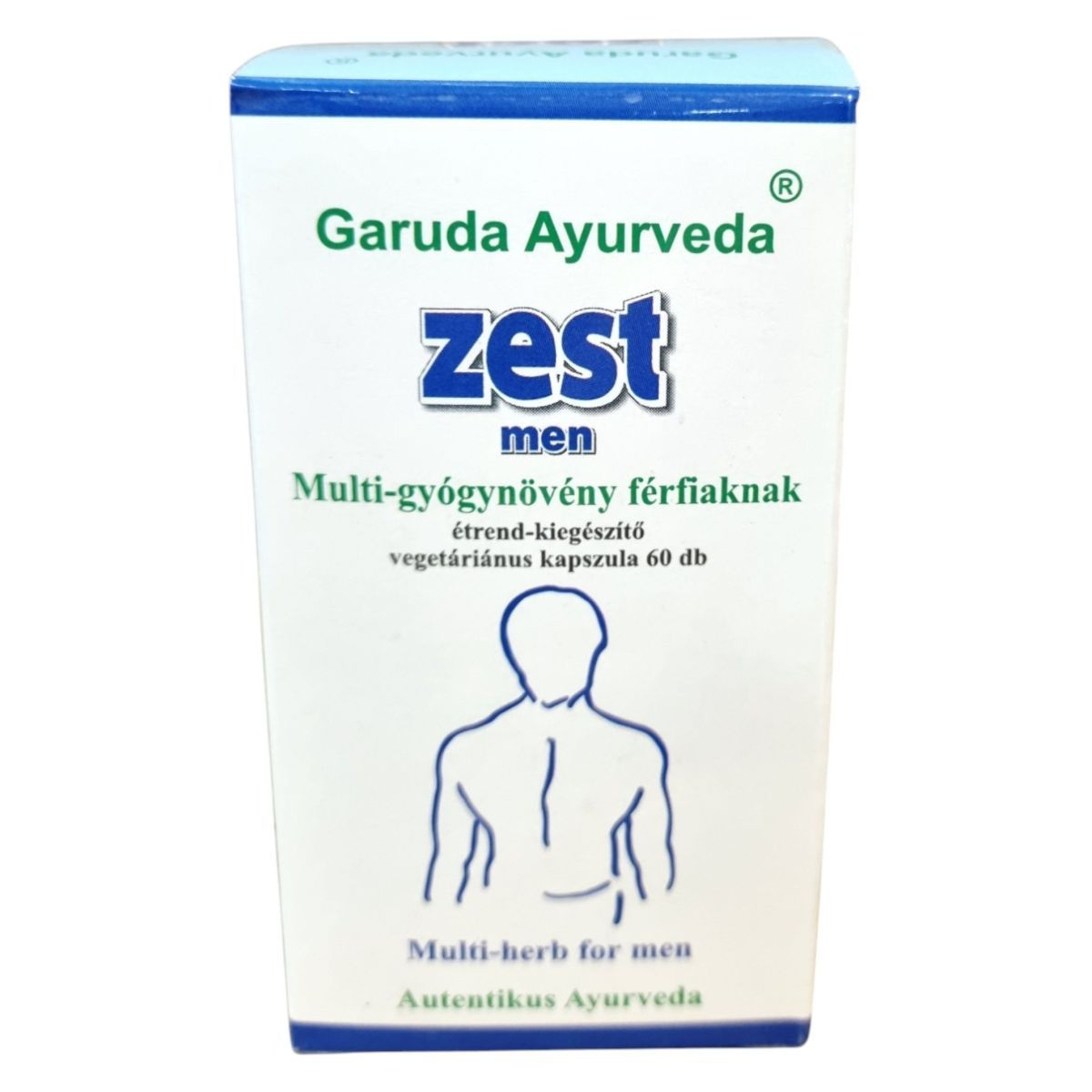 A Garuda Ayurveda zest men egy autentikus ayurvédikus étrend-kiegészítő, amely különféle gyógynövények kombinációját tartalmazza, mint például az Arjuna, Ashwagandha, Amla és Brahmi. Ezek a gyógynövények hozzájárulhatnak a máj, a húgyhólyag és az emésztőrendszer egészséges működéséhez, valamint támogathatják a fizikai és szellemi tűrőképességet. A termék 60 vegetáriánus kapszulát tartalmaz, és nem tartalmaz hozzáadott cukrot, kemikáliákat, keményítőt vagy tartósítószereket. A termék Indiában készült, és a Garuda Trade Kft. forgalmazza Magyarországon.