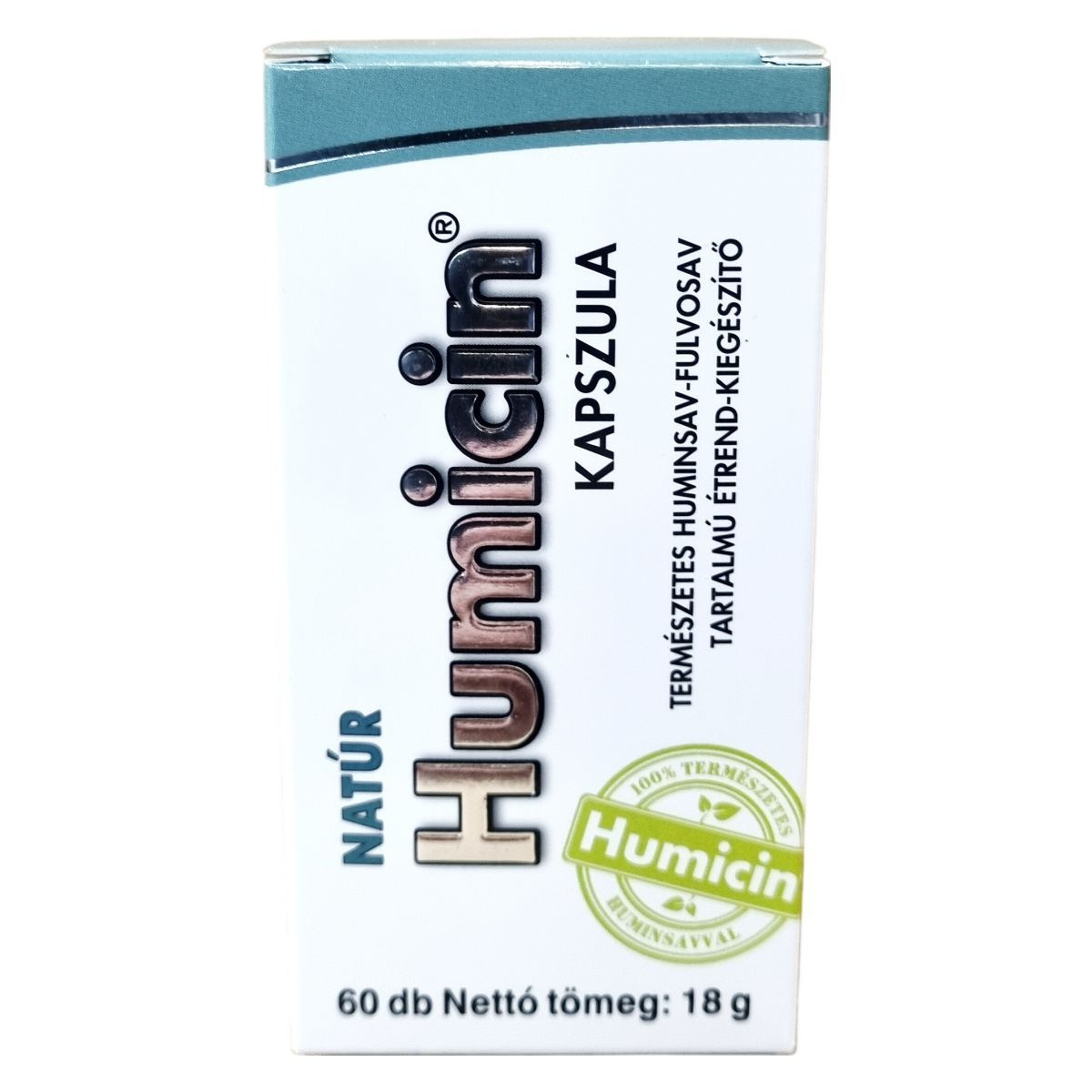 A NATÚR Humicin® kapszula egy természetes huminsav-fulvosav tartalmú étrend-kiegészítő, amely 60 db kapszulát tartalmaz, összesen 18 g nettó tömegben. A termék Humicin porból áll, amely huminsav-fulvosavat tartalmaz, továbbá kapszula alapanyaga hydroxi-propil-cellulóz és csomósodásgátló anyagként zsírsavak magnéziumsóit. A napi ajánlott adag 2x1 kapszula, amelyet étkezések előtt, bőséges folyadékkal célszerű bevenni. A termék nem helyettesíti a változatos és kiegyensúlyozott étrendet, illetve az egészséges életmódot. Tárolása száraz, hűvös és fényvédett helyen ajánlott, gyermekektől elzárva. A terméket a HUMIC 2000 Kft. gyártja és forgalmazza Budapesten.