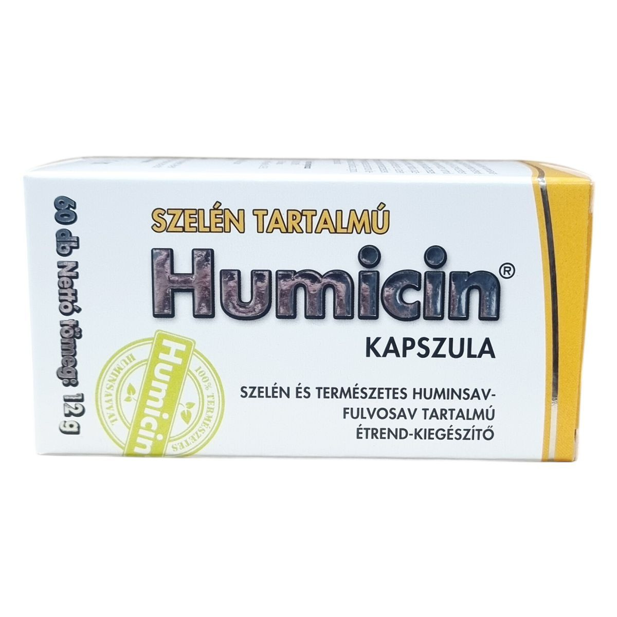 A Humicin® Szelén tartalmú kapszula egy természetes összetevőkből álló étrend-kiegészítő, amely szelént és huminsav-fulvosavat tartalmaz. A szelén hozzájárulhat az immunrendszer normál működéséhez, a sejtek oxidatív stresszel szembeni védelméhez, valamint a pajzsmirigy normál működéséhez, továbbá részt vehet a normál spermaképződés folyamatában. A terméket különösen kiegyensúlyozatlan táplálkozás vagy szigorú diéta esetén javasolt használni. A kapszula 60 darabos kiszerelésben érhető el és napi két alkalommal ajánlott szedni étkezések előtt, bőséges folyadékkal. A termék nem helyettesíti a változatos étrendet és az egészséges életmódot. Tárolását száraz, hűvös és fényvédett helyen kell biztosítani, valamint kerülni kell, hogy gyermekek hozzáférhessenek. A kapszula összetevői között szerepel mikrokristályos cellulóz, hidroxipropil-cellulóz alapú kapszula, Humicin por (huminsav-fulvosav), csomósodást gátló zsírsavak magnéziumsói és nátrium-szelenit.