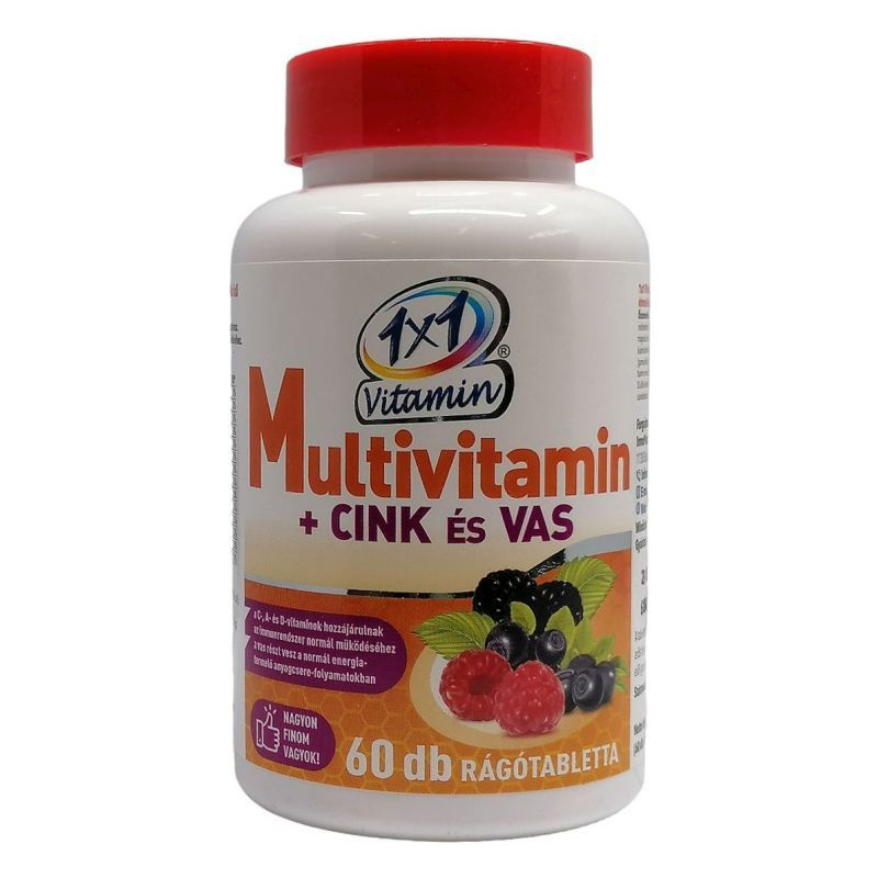 Az 1x1 Vitamin Multivitamin + CINK és VAS rágótabletta egy erdei gyümölcs ízű étrend-kiegészítő, amely különféle vitaminokat és ásványi anyagokat tartalmaz. A termék célja, hogy támogassa az immunrendszer normál működését és hozzájáruljon a fáradtság csökkentéséhez. A rágótabletták édesítőszerekkel készülnek, és a színezékek természetes forrásokból, mint a cékla és a fekete répa származnak. A termék ideális lehet azok számára, akik szeretnék kiegészíteni étrendjüket vitaminokkal és ásványi anyagokkal.