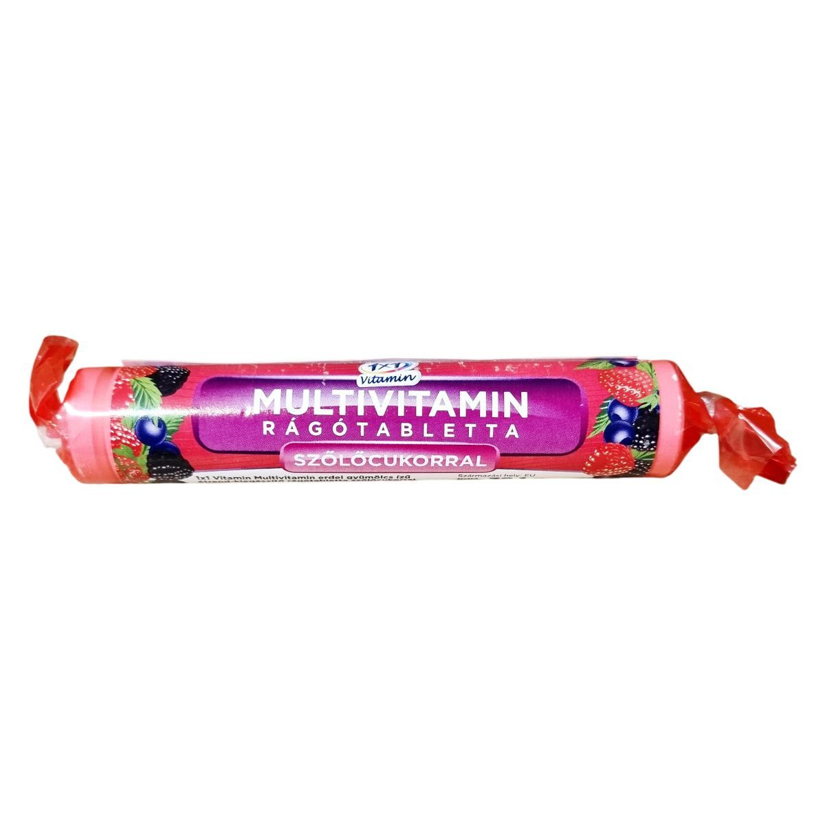 Erdei gyümölcs ízű étrend-kiegészítő rágótabletta szőlőcukorral.