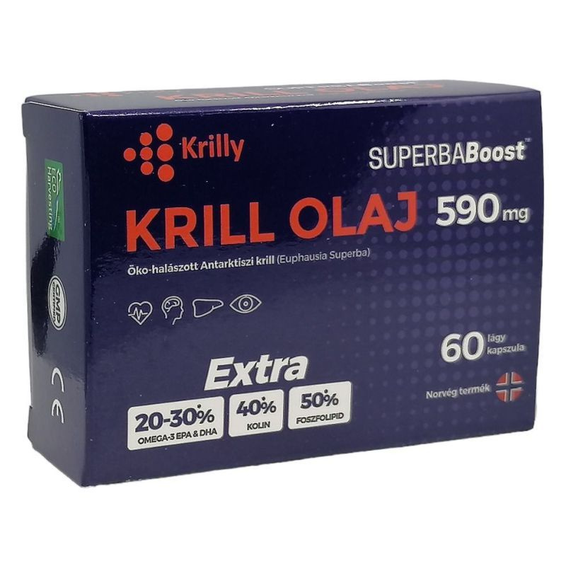 A Krilly 590mg krill olaj egy különleges megnövelt hatóanyag tartalmú termék. 20-30%-kal több Omega-3 EPA és DHA, 40%-kal több Kolin és 50%-kal több Foszfolipid tartalmaz.