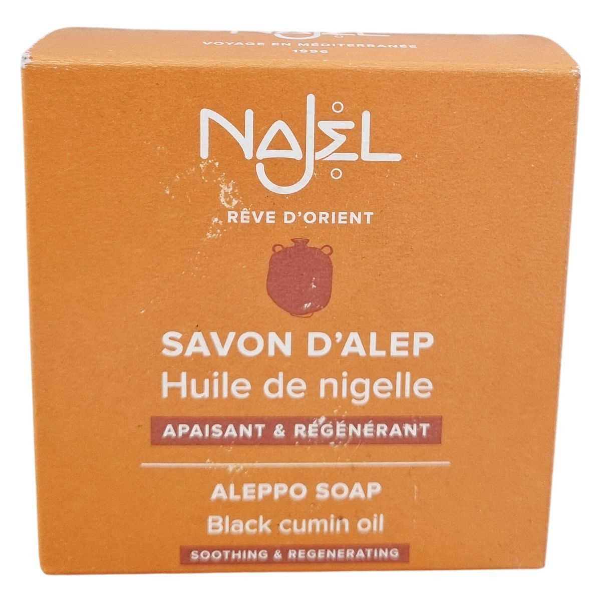 A Najel Aleppo szappan feketeköményolajjal (Nigella) kiegészítve készül, amely gazdag antioxidáns-tartalmáról ismert. A hagyományos módon, Aleppóban gyártott, oliva- és babérolaj-alapú szappan kíméletesen tisztítja a bőrt, miközben nyugtató és regeneráló hatást biztosít. A termék mindennapi használatra ajánlott, és minden bőrtípus számára megfelelő. A csomagoláson francia és angol jelölések is szerepelnek, például „Apaisant & Régénérant”, „Soothing & Regenerating”, illetve a használati ikonok a nappali és éjszakai rutinban való alkalmazhatóságot mutatják. A szappan teljesen vegán, a doboz pedig 100% újrahasznosított kartonból készült.