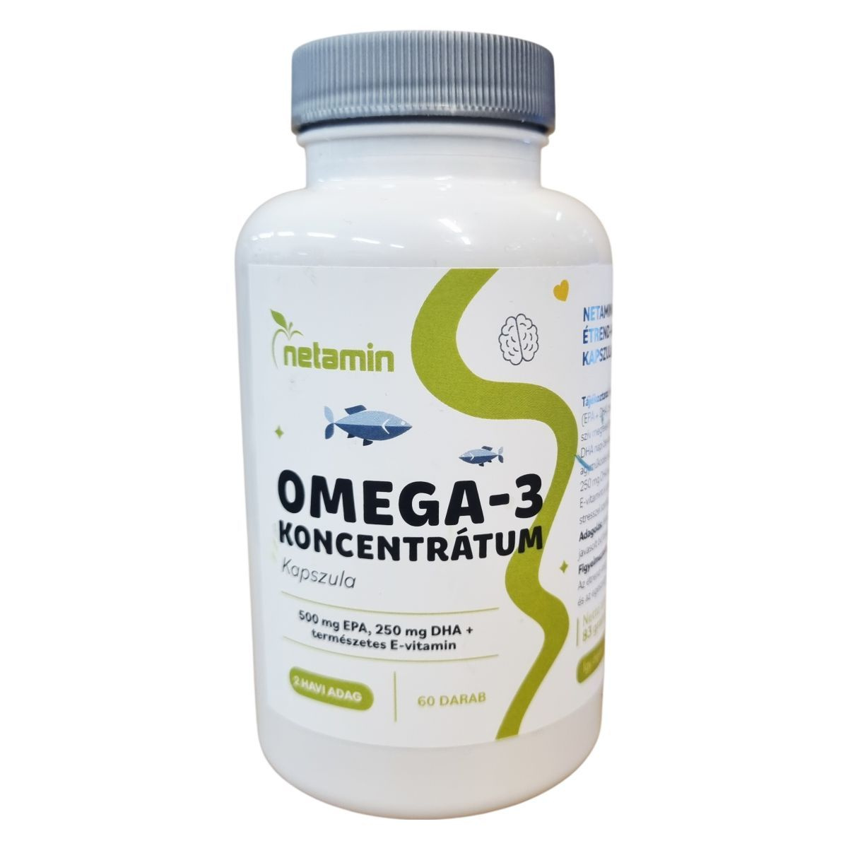 A netamin Omega-3 Koncentrátum étrend-kiegészítő lágyzselatin kapszula, amely halolajat és természetes E-vitamint tartalmaz. Egy kapszula 1000 mg halolajat tartalmaz, magas EPA és DHA zsírsavtartalommal, amelyek hozzájárulhatnak a szív megfelelő működéséhez, az agyműködés és a látás fenntartásához a napi ajánlott bevitel szerint. A természetes E-vitamin antioxidáns tulajdonsággal rendelkezik, így támogathatja a sejtek oxidatív stresszel szembeni védelmét. A kapszula lágyzselatinból készül, amely glicerint és ivóvizet is tartalmaz a megfelelő állagért. A termék nettó tömege 83 gramm, és a csomagolás 60 kapszulát tartalmaz, ami két havi adagnak felel meg. Az ajánlott adagolás naponta egy kapszula, bő folyadékkal, étkezés közben. A termék használata mellett javasolt a vegyes étrend és az egészséges életmód betartása.