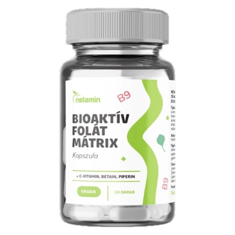 A Netamin Bioaktív Folát Mátrix kapszula egy vegán étrend-kiegészítő, amely folátot, C-vitamint, betaint és feketebors kivonatot tartalmazhat. A folát hozzájárulhat a normál vérképződéshez, a homocisztein-anyagcseréhez, a pszichológiai funkciók fenntartásához, és szerepet játszhat a sejtosztódásban. Terhesség alatt részt vehet az anyai szövetek növekedésében. A C-vitamin és a folát támogathatják az immunrendszer normál működését, valamint csökkenthetik a fáradtság és kifáradás érzését. A termék 30 kapszulát tartalmaz, és a Natural Herbal Kft. forgalmazza.