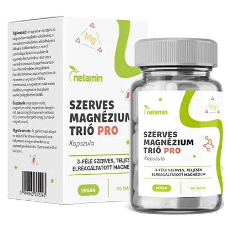 A Netamin Szerves Magnézium Trió tabletta háromféle szerves magnéziumforrást tartalmaz: magnézium-citrátot, magnézium-biszglicinátot és magnézium-orotátot. Ezek a formák hozzájárulhatnak a fáradtság és kifáradás csökkentéséhez, valamint támogathatják az idegrendszer és az izmok normál működését. A termék bio étrendi irányzatba illeszkedik, és napi 1 tabletta szedése javasolt. A terméket száraz, sötét helyen, szobahőmérsékleten, gyermekektől elzárva kell tárolni. A termék forgalmazója az Organikus Egészség Egyesület.