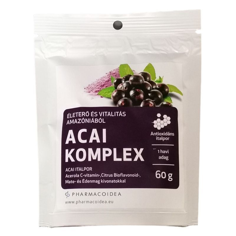 Az Acai Komplex antioxidáns italpor egy hónapos adagja 60 g kiszerelésben érhető el. Az acai bogyó kimagasló antioxidáns tartalmával igazi szupernövényként ismert. Az acerola C-vitamin tartalma hozzájárulhat az immun- és idegrendszer normál működéséhez, valamint a fáradtság tüneteinek csökkentéséhez. A citrus bioflavonoidok támogathatják az immunrendszer egészséges működését. A mate kivonat elősegítheti a normál energiaszint fenntartását és a stressz tüneteinek csökkentését, míg az édenmag kivonat a normál cukoranyagcsere támogatásával hozzájárulhat az ideális testsúly eléréséhez.
