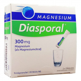 A Magnesium-Diasporal 300 mg egy étrend-kiegészítő granulátum, amely 20 db 5g granulátumot tartalmazó tasakban kapható. A termék könnyen oldódik vízben vagy gyümölcslében, és narancs ízesítésű. A magnézium hozzájárulhat a normál izomműködéshez, az idegrendszer megfelelő működéséhez, a fáradtság és kifáradás csökkentéséhez, valamint a normál csontozat és fogazat fenntartásához. Ajánlható várandós és szoptatós kismamáknak, fogyókúrázóknak, sportolóknak. A termék nem pezseg, és szacharózt, valamint nátriumot tartalmaz. A granulátum technikai okokból nem teljesen tölti ki a tasakot.