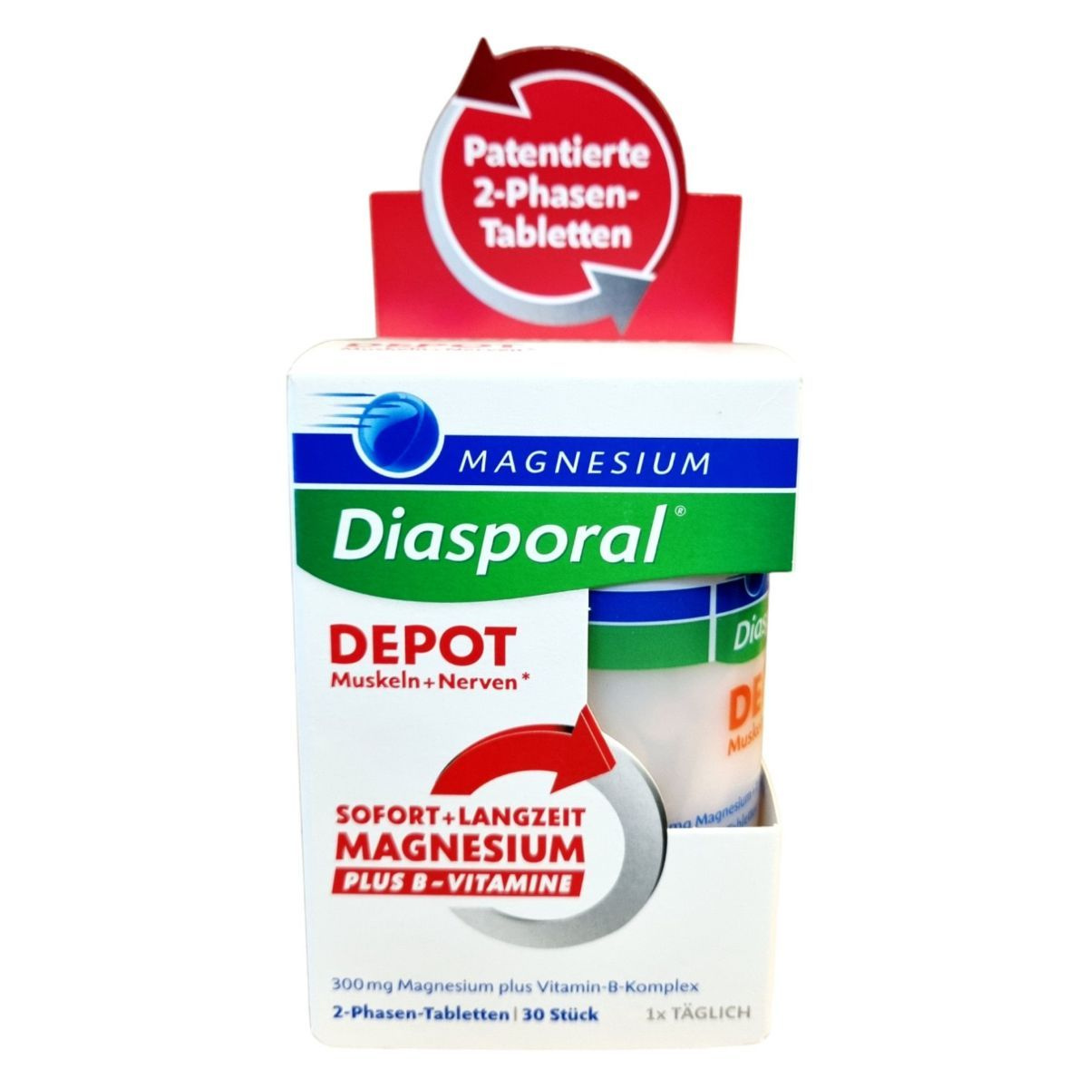 A Magnesium Diasporal DEPOT egy 2-fázisú étrend-kiegészítő tabletta, amely azonnal és hosszan tartó felszívódó magnéziumot, valamint B-vitaminokat (B1, B2, B6, B12) tartalmaz. A termék célja, hogy támogassa az izmok és az idegrendszer normál működését, különösen azok számára, akik nagy nyomás alatt állnak a munkahelyükön, tanulmányaik során vagy családi környezetben. A tabletta cukor-, glutén- és laktózmentes, valamint vegán étrendbe is beilleszthető. A termék nem alkalmas gyermekek számára, és súlyos veseelégtelenség esetén nem ajánlott a fogyasztása.