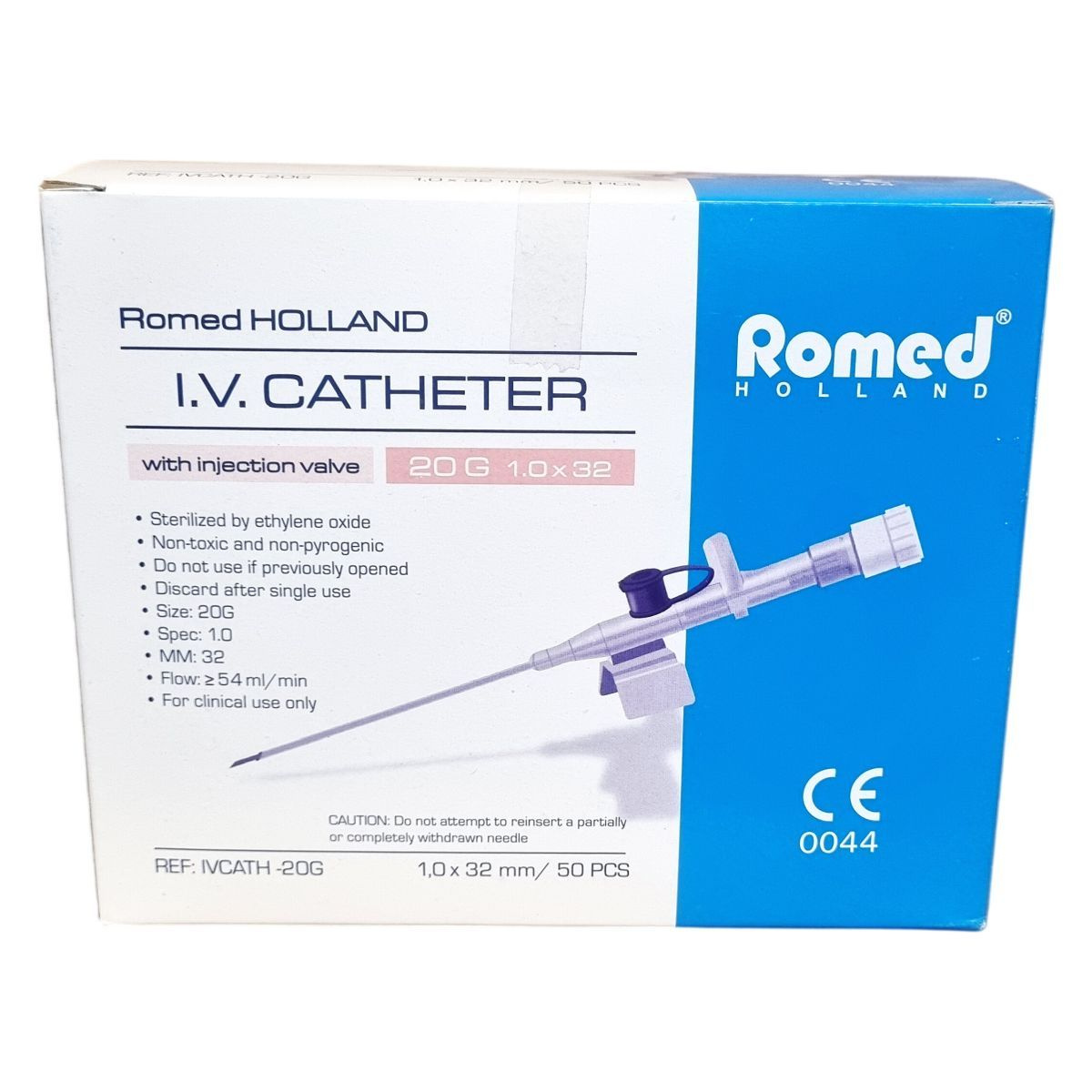 A Romed Holland I.V. katéter egy steril, etilén-oxiddal sterilizált eszköz, melyet egyszeri használatra terveztek, így használat után eldobandó. A kanül 20G méretű, 1,0 mm átmérőjű és 32 mm hosszú, szeleppel ellátott kialakítással, mely megkönnyíti az injekció beadását. Az eszköz megfelel az EN-10555-5 szabványnak, különböző színkódokkal és méretekkel érhető el az eltérő klinikai igényekhez. A termék non-toxikus és non-pyrogén, kizárólag klinikai használatra készült, használata során garantálja a legalább 54 ml/perc áramlási sebességet. Az injekciós szelep használatával biztonságosabbá válik a gyógyszeradagolás, csökkentve az esetleges fertőzés kockázatát. Gyártóként a Van Oostveen Medical B.V., Hollandia ismert, és a termék rendelkezik CE tanúsítvánnyal.