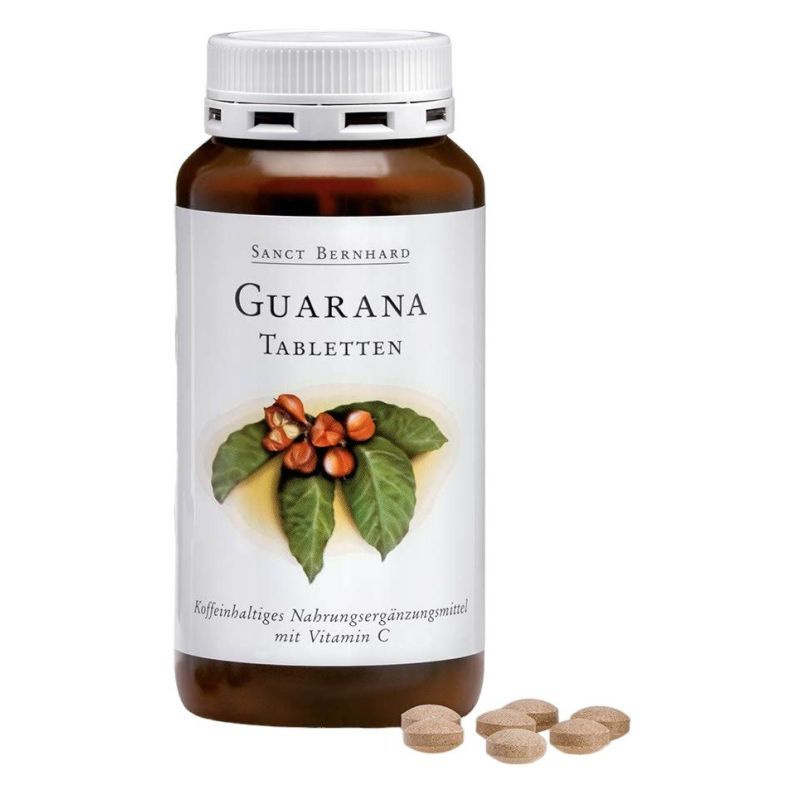 A SANCT BERNHARD Guarana tabletta egy étrend-kiegészítő, amely guaranát és C-vitamint tartalmaz. A guarana természetes koffeinforrás, amely hozzájárulhat az éberség fenntartásához és a fáradtság csökkentéséhez. A C-vitamin fontos szerepet játszhat az immunrendszer normál működésének támogatásában. A termék magnéziumot is tartalmaz, amely hozzájárulhat az izmok normál működéséhez. A tabletták napi háromszori fogyasztása ajánlott, étkezések előtt bő folyadékkal. A terméket hűvös, száraz helyen kell tárolni, és gyermekektől elzárva tartandó. A termék koffeint tartalmaz, ezért gyermekek és terhes nők számára nem ajánlott.