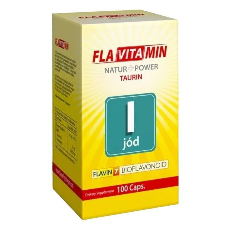A magyar emberek jód ellátása azonban jelenleg elégtelen, ivóvizeink jódtartalma mindig is alacsonyabb volt, mint a tenger közeli országokban. A mostani jódhiány fő oka, hogy az ivóvizek klórozása számottevően hatástalanítja a szervezetünkbe korábban így bekerülő jódot. Figyelembe véve a vizsgálati eredményeket és az emberek napi ivóvíz fogyasztásának a mennyiségét, megállapítható, hogy a magyar emberek 80 %-a jelenleg jódhiányban szenved. - Dr. Czeizel Endre orvosgenetikus. Az alapvető magyarországi jódhiány és a fukushimai atomerőmű által okozott nukleáris katasztrófa által okozott radioaktív jód előfordulása miatt szükséges lehet a természetes jód bevitele a szervezetünkbe. Dr. Turai István, az Országos "Frédéric Joliot-Curie" Sugárbiológiai és Sugáregészségügyi Kutató Intézet megbízott főigazgatója felhívta a figyelmet arra, hogy az elmúlt heti radióaktív jód előfordulásának mérési eredményei, tehát a levegő sugárszennyezettsége a szokásos arány 5-10 szeresét mutatta ki Budafokon. Mivel a pajzsmirigy raktározza a jódot, ilyen esetekben fennáll a veszély, hogy nagy koncentrációban gyulik fel a radioaktív jód a pajzsmirigyben. Ilyen esetben a pajzsmirigyet telíteni kell jóddal, hogy megakadályozzuk a radioaktív jód raktározását. Taurin: mi is az a taurin? A taurin az emberi szervezetben is előforduló kéntartamú aminosav (az aminosavak a fehérjék alkotórészei), amely legnagyobb mennyiségben az agyban és az idegrendszerben található meg, az anyatejben pedig a második legnagyobb mennyiségben jelenlévő aminosav. Az emberi szervezetben kilogrammonként 1 gramm taurin van. A taurin az összes, szívben jelenlévő szabad aminosav 50%-át teszi ki. Különböző módokon részt vehet a teljesítmény és az egészség megőrzésének folyamataiban. Miben található? Legfőbb forrásai a tenger gyümölcsei (kagyló, rák) és a hal. Az egyéb húsokban és az anyatejben is természetes formában fordul elő. Az anyatejben a második legnagyobb mennyiségben képviselt aminosav. Mi a szerepe? Energiatovábbítóként és méregtelenítőként működik. Stabilizálja a sejtmembránokat és szabályozza a kalciumkoncentrációt. Különböző módokon részt vesz a teljesítmény és az egészség megőrzésének folyamatain, többek közt a folyadékok szintjének szabályozásával az izomsejtekben, az ásványok szállításával, hatásával van az inzulin és az adrenalin szintjére, az anyagcserére, a zsiradékok emésztésére, az immunrendszerre, a koleszterinszintre, a sperma és epe termelésére. Jelenléte elengedhetetlen az idegrendszer optimális fejlődéséhez. Ha a szervezetben alacsony a taurin szint, különböző zavarok jelentkezhetnek, például a szívizom károsodása, a recehártya rendellenes fejlődése és növekedési visszaesések. A taurin az összes, szívben jelenlévő szabad aminosav 50 %-át teszi ki. Pozitív hatást fejt ki a szívizomra és több kutatás során kimutatták, hogy csökkenti a vérnyomást. A taurin segít a sejt belsejében lévő kalcium szintjének szabályozásában. Ha tehát a szervezetben elegendő taurin található, úgy a szív elmeszesedésének veszélye jelentősen csökken. A taurin adagolás a stresszes állapotban lévő, extrém energiát kifejtő szervezet számára, a szellemi tevékenység és a cukorbetegek megsegítésére hasznos. Kutatási eredmények: egy kísérlet során a taurin az inzulin 50%-os kapacitásának megfelelő mennyiségű glükóz bevitelt stimulált a sejtekbe. Egy másik, ugyancsak az inzulint és a taurint összehasonlító kísérlet során a taurin megnövelte a prolin nevű aminosav bevitelét. Érdekes módon az inzulin-taurin kombináció nem hozott jobb eredményt, mint a két anyag egyedül. A glutaminhoz hasonlóan, sokan vélik a taurint is meghatározóan fontosnak a kondíció szempontjából. Bár normális állapotban szervezetünk előállít valamennyi taurint, a hiánya bizonyos szövetek funkcionális elégtelenségében mutatkozik meg. Összetevők: Taurin, Flavin 7 bioflavonoid komplex (vörös szőlő mag-héj szárítmány; cirok mag-héj szárítmány; feketeszeder mag-héj szárítmány; feketecseresznye héj szárítmány, feketeribizli mag-héj szárítmány, pirosribizli mag-héj szárítmány, szilva héj szárítmány almahéj szárítmány), zselatin, zöld tea, jód (kálium-jodid). Felhasználási javaslat: 3x1 kapszula/nap. Az ajánlott napi mennyiséget ne lépje túl. Az étrend-kiegészítő nem helyettesíti a kiegyensúlyozott vegyes étrendet és az egészséges életmódot!