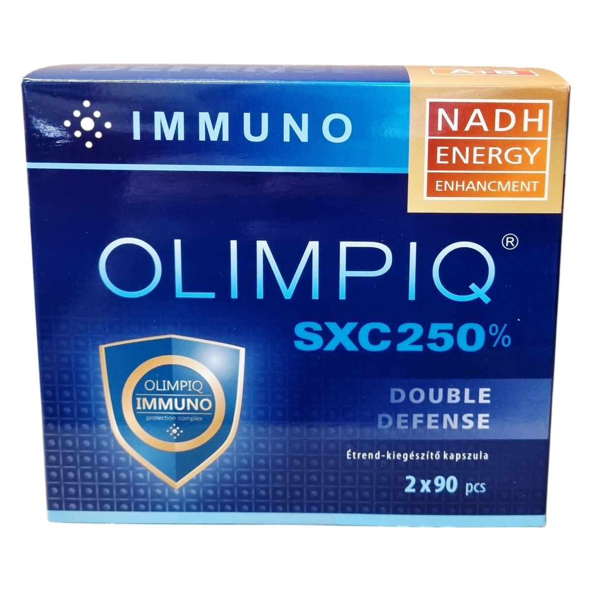 IMMUNO. NADH ENERGY ENHANCMENT. DOUBLE DEFENSE. OLIMPIQ IMMUNO protection complex. Nettó tömeg A: 56,4 g (90 x 627 mg). Nettó tömeg B: 55,2 g (90 x 613 mg). 2x90 pcs.