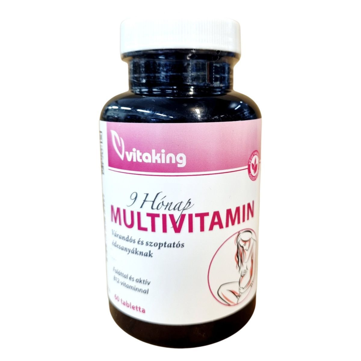A Vitaking 9 Hónap Multivitamin kifejezetten várandós és szoptatós édesanyáknak készült, és folsavat, valamint aktív B12-vitamint tartalmazhat. A folát a terhesség alatt részt vehet az anyai szövetek növekedésében, míg az A-, C-, és D-vitamin hozzájárulhat az immunrendszer normál működéséhez. A D-vitamin továbbá támogathatja a normál fogazat és csontozat fenntartását. A termék 60 tablettát tartalmaz, és napi egy tabletta fogyasztása javasolt étkezés közben.