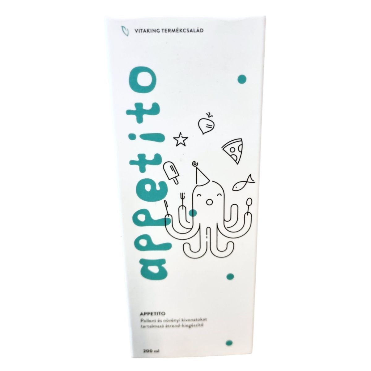 A Vitaking Appetito egy pollen és növényi kivonatokat tartalmazó étrend-kiegészítő, amely 200 ml-es kiszerelésben kapható. A termék összetevői között megtalálható a pollen, búzacsíra, ezerjófű, sárga tárnicsgyökér és görögszéna kivonat, melyek hozzájárulhatnak az étvágyhoz és segíthetik az emésztést. A termék használata előtt felrázandó, és közvetlenül lenyelhető vagy hígítható vízzel vagy gyümölcslével. A terméket száraz, hűvös helyen, sugárzó hőtől és fénytől védve kell tárolni. Terhesség és szoptatás alatt nem ajánlott a fogyasztása. Az OGYÉI nyilvántartási száma: 26167/2021.