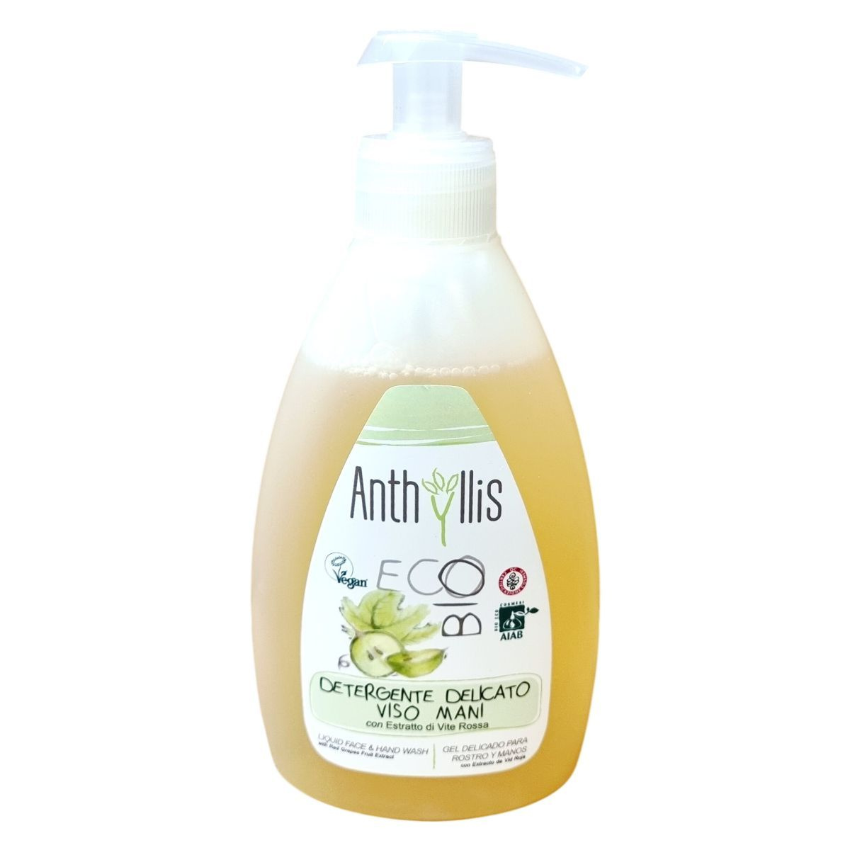Az Anthyllis 1791 BIO folyékony szappan bio szőlőhéj kivonatot tartalmaz, amely antioxidánsokban, például proanthocyanidinekben, katekinben és galluszsavban gazdag. A termék természetes illóolajokkal biztosít intenzív virágos illatot, miközben kíméletesen tisztítja az arcot és a kezeket. Bőrgyógyászatilag tesztelt, a nehézfém-tartalom (nikkel, króm, kobalt) 0,4 ppm alatt van, így allergénkockázata alacsony. Nem tartalmaz káros összetevőket, mint a SLS, SLES, PEG, fenoxietanol vagy parabének, és szintetikus illatanyagoktól mentes. Az összetevők között megtalálható a natúr eredetű grape leaf extract, valamint bio mezőgazdaságból származó komponensek, melyek hozzájárulnak a bőr ápolásához és védelméhez.