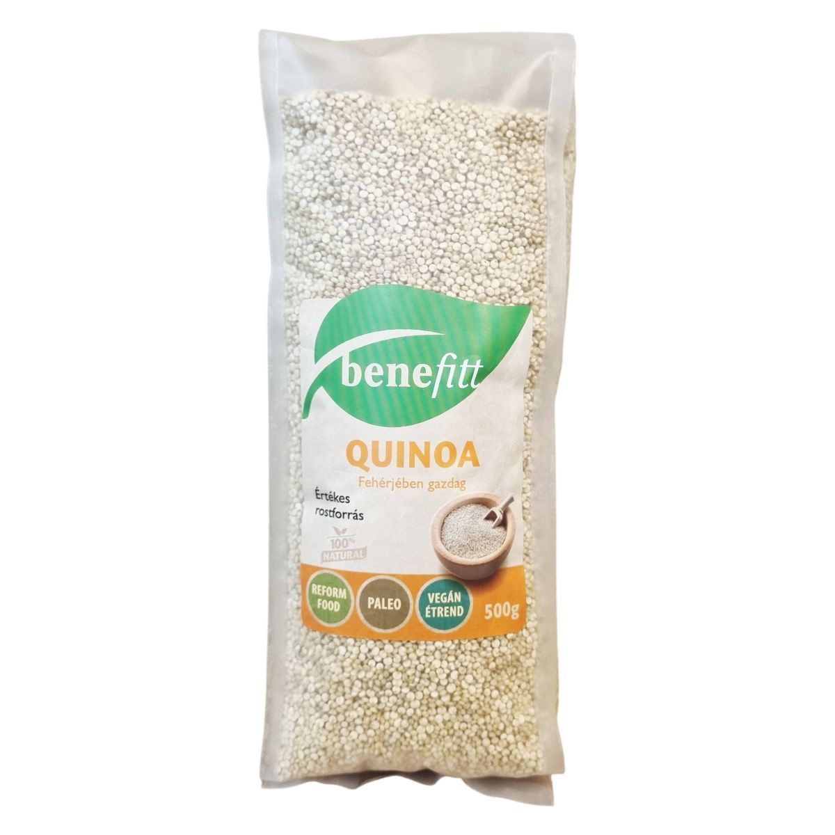 A Benefitt quinoa egy teljes értékű, gluténmentes mag, amely magas fehérje- és rosttartalma miatt akár egy kiegyensúlyozott étrendben is jól illeszthető lehet. Használható kásaként, köretként vagy töltelékként — felhasználása egyszerű, és akár háromszoros tömegű is lehet főzés után, ezáltal gazdaságos és kiadós. Tárolása praktikus, és hosszabb távon is megőrzi minőségét megfelelő környezetben. Forgalmazója a BGB Interherb Kft.