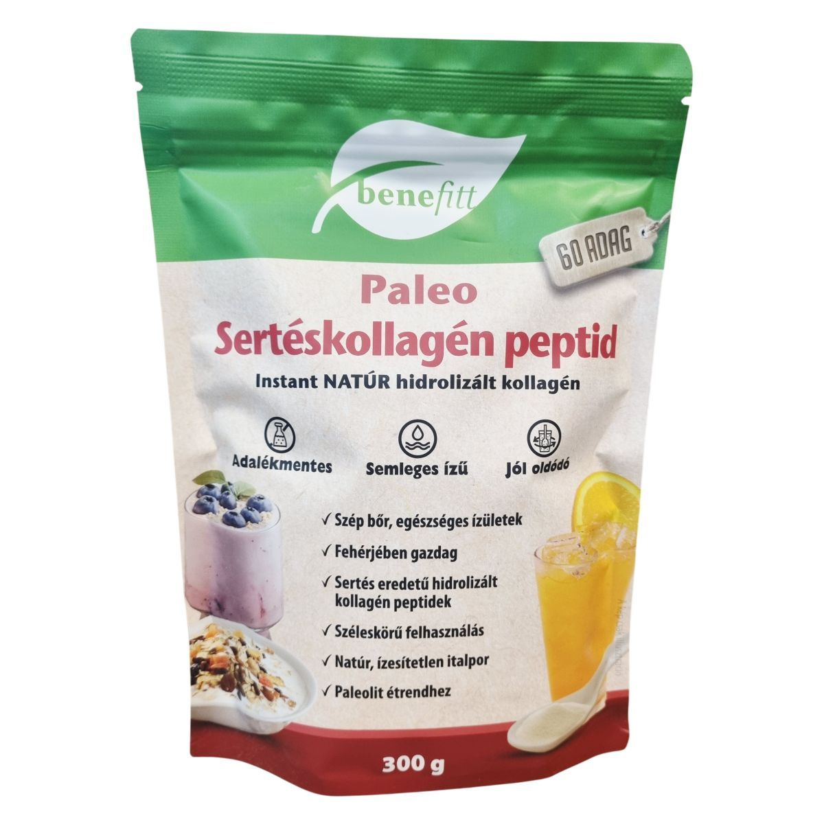 A benefitt Paleo Sertéskollagén peptid egy adalékmentes, natúr, ízesítetlen italpor, amely sertés eredetű hidrolizált kollagén peptideket tartalmaz. Fehérjében gazdag termék, amely hideg és meleg italokban egyaránt jól oldódik, és természetes módon glutén- valamint laktózmentes. Széles körben használható, akár teában, vízben, gyümölcslében vagy joghurtban is fogyasztható, és alkalmas paleolit étrendhez. Az előállító üzem nem használ fel búzát, gluténforrást, szóját, tojást, tej- és tejszármazékokat, ezáltal segíthet az allergének elkerülésében. A termék csomagolóanyaga 100%-ban újrahasznosítható, így környezettudatos választás lehet.