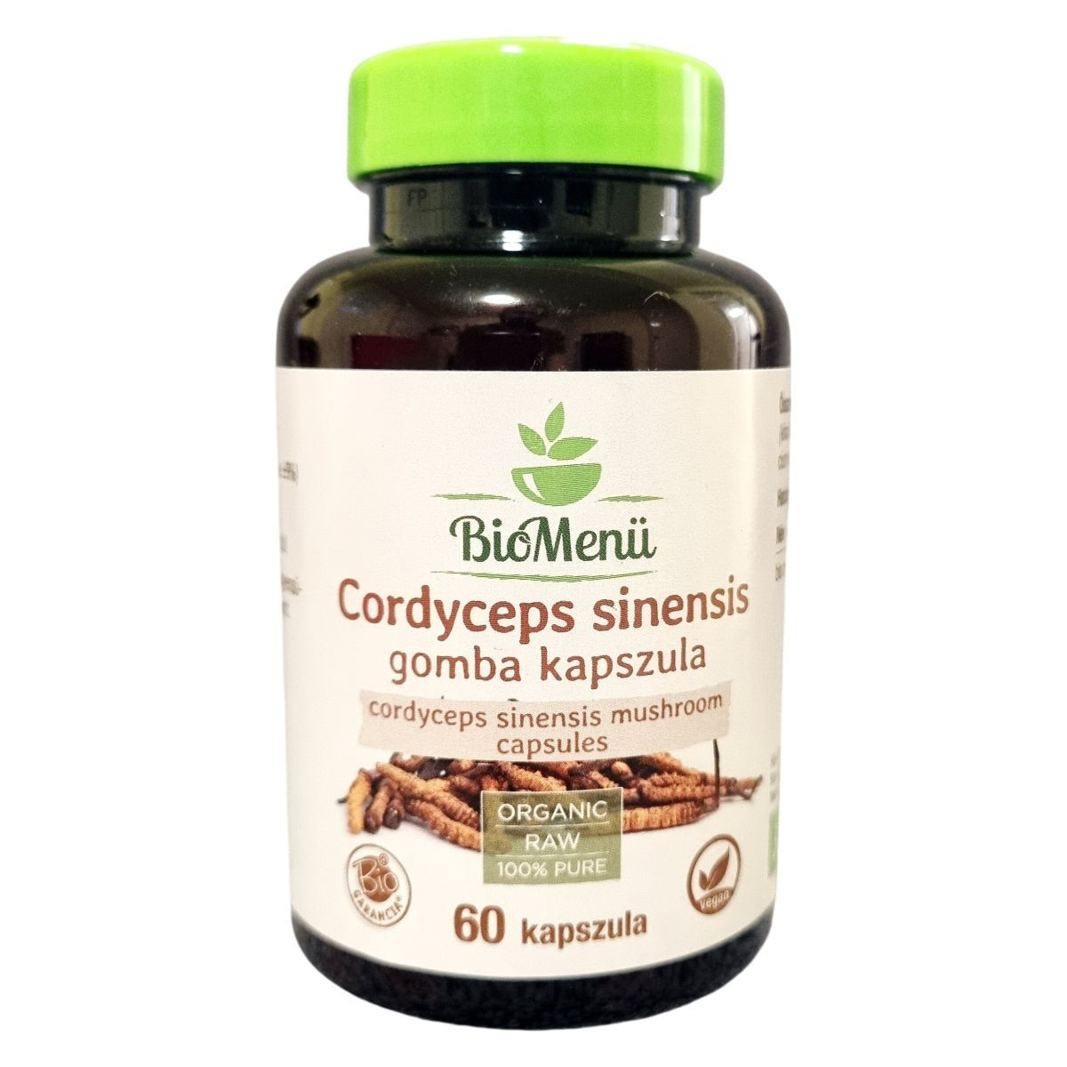 A BioMenü bio cordyceps sinensis gomba kapszula nettó tömege 37,2 g, amely 60 db, kapszulánként 620 mg terméket tartalmaz. A termék származási helye Kína, és az alapanyagok között szerepel a bio cordyceps sinensis gombapor, egy csomósodást gátló anyagként alkalmazott szilícium-dioxid, valamint kapszulahéjként hidroxipropil-metil-cellulóz. Ez a kapszula 100% tiszta, organikus és nyers növényi eredetű összetevőből készül, így vegánok számára is alkalmas lehet. A termék HU-ÖKO-02 tanúsítvánnyal rendelkezik, mely a nem EU mezőgazdaságból származó bio alapanyagokat igazolja. A terméket érdemes száraz, hűvös és fényvédett helyen tárolni, gyermekektől elzárva.