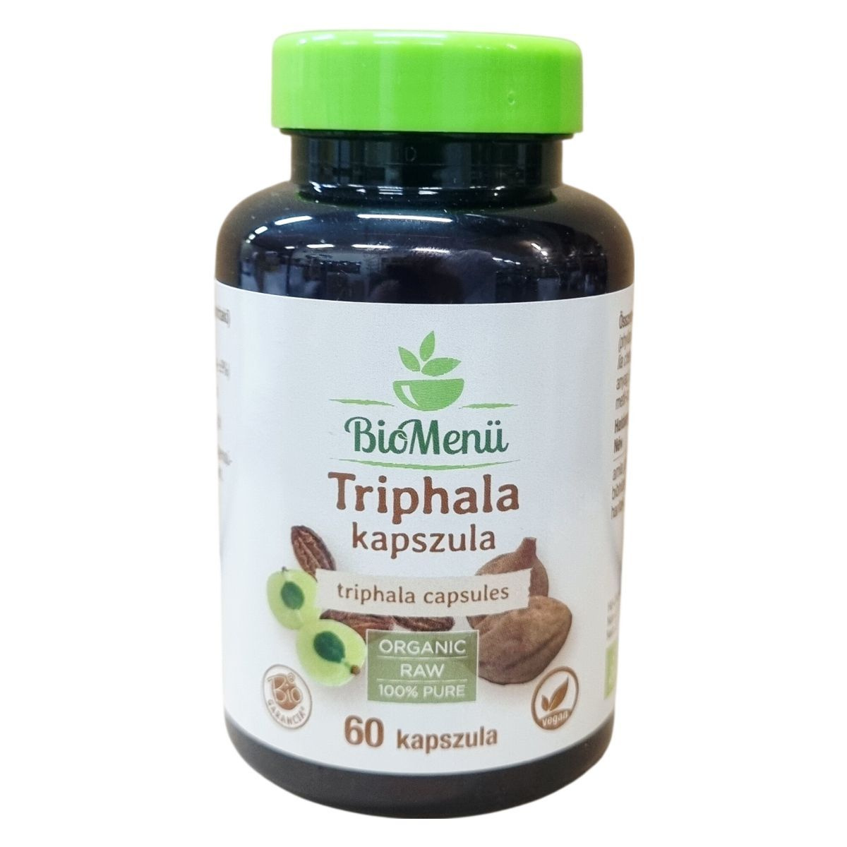 A BioMenü Triphala kapszula 60 db 620 mg-os kapszulát tartalmaz birtokló termék, amely Indiából származik. Kizárólag természetes és bio alapanyagokat használ, úgymint amla (Phyllanthus emblica), bibhitaki (Terminalia bellirica) és haritaki (Terminalia chebula) gyümölcsök őrleményét. A kapszula vegán és csomósodásgátló anyaga a szilícium-dioxid, míg a kapszulahéj hidroxipropil-metil-cellulózból készül. A termék rendelkezik HU-ÖKO-02 minősítéssel, mely nem EU mezőgazdasági eredetet jelez. A napi adag 3 kapszula, amely biztosíthatja a Triphala kivonatok rendszeres bevitelét.