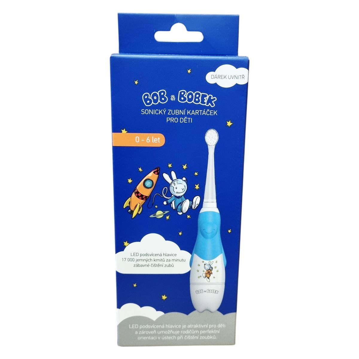 A Bob & Bobek szónikus fogkefe LED megvilágítású fejjel a szülők igényeihez igazodik, megkönnyítve a gyermekek fogainak alapos tisztítását, miközben a világítás vonzóvá teszi a fogmosást a gyerekek számára. A készülék 17 000 kíméletes rezgéssel tisztít percenként, időzítője pedig 4 x 30 másodperces szakaszokra osztja a fogmosást, hogy egyenletesen tisztítsa a fogfelszíneket. A csomag két különböző méretű fejjel érkezik, így a használat a korcsoportnak megfelelő, valamint egy praktikus kis csavarhúzóval, amely a AAA elemek cseréjéhez szükséges. Az AAA típusú elem legalább 2 hónap működést biztosít. A fogkefe ergonomikus nyéllel rendelkezik, amely könnyen fogható a gyermek keze számára. A termék vízállósági minősítése IPX7, így biztonságosan használható nedves környezetben. A motiváció megkönnyítésére a csomag matricákat is tartalmaz Bob és Bobek figurákkal, továbbá QR-kód segítségével elérhetőek fogmosást segítő játékok és foglalkoztató anyagok.
