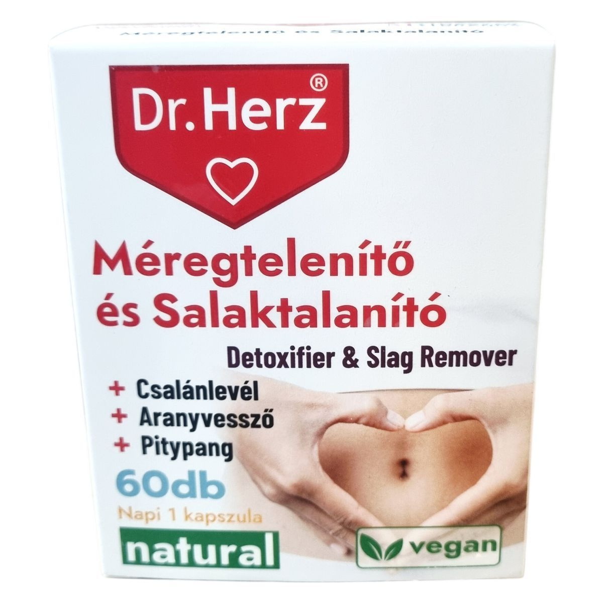 A Dr.Herz Méregtelenítő és Salaktalanító kapszula növényi eredetű hatóanyagokat, például csalánlevél, aranyvessző virágos hajtás, pitypang levél és gyökér, bodzavirág, valamint feketeribizli levél őrleményeket tartalmaz. A készítmény B6-vitamint is magában foglal, amely szerepet játszhat az anyagcsere folyamatokban. A kapszula támogatja a szervezet méregtelenítő funkcióit, különösen a máj, az epe és a vesék működését, természetes detoxifikáló és diuretikus hatása révén. Az összetevők hatásai között megtalálhatóak a salaktalanítás, az emésztés segítése, illetve a gyulladáscsökkentő hatás is. Fontos, hogy a termék használata mellett az ajánlott napi mennyiséget be kell tartani, és nem helyettesíti az egészséges életmódot vagy a kiegyensúlyozott étrendet.