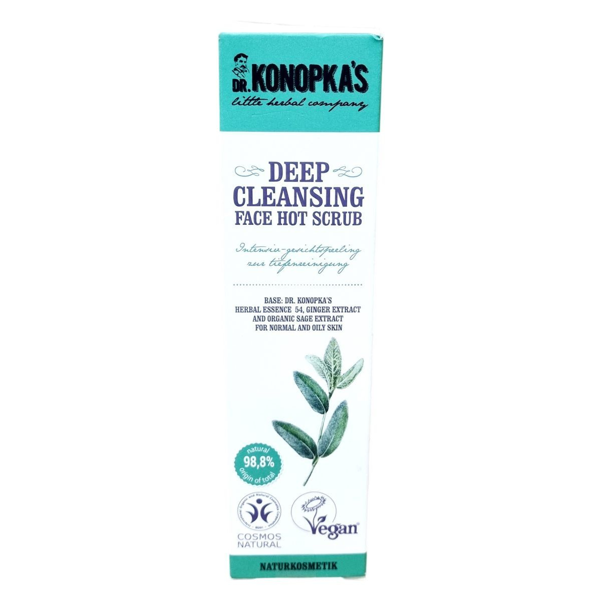 A Dr. Konopka's termékek egy kis hagyományos gyógynövényboltból származnak, ahol évszázadokon át gyűjtött növényi alapú, vitalizáló recepteket őriznek. Ez az intenzív arcradír a különleges 54-es növényi esszencián alapul, amely segíti a bőr hámlasztását, mélytisztítását és megújítását. A gyömbér és a szerves zsályakivonat együttesen tonizáló és frissítő hatású, elősegítve a bőr simaságát és feszességét. Természetes összetevőinek aránya 98,8%, normál és zsíros bőrre ajánlott. A termék vegán és természetes kozmetikumként minősített, és Európában készült.