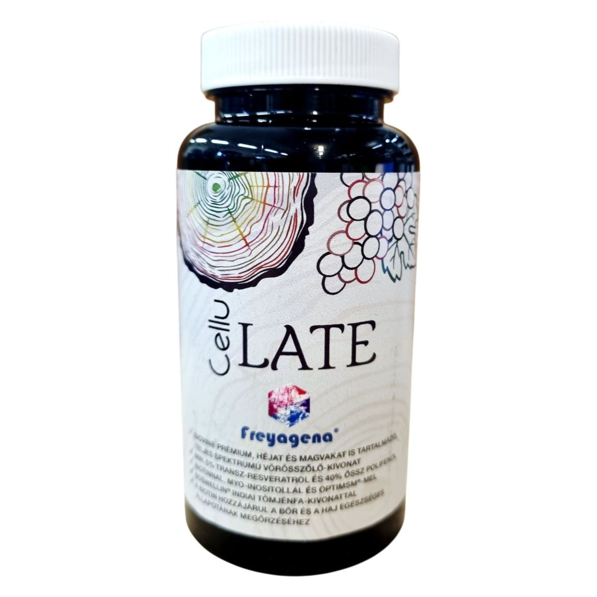 A freyagena® CelluLATE egy prémium minőségű étrend-kiegészítő, amely BIOVIN® vörösszőlő-kivonatot tartalmaz, beleértve a héjat és a magvakat is. A termék transz-resveratrolt és 40% össz-polifenolt tartalmazhat, amelyek hozzájárulhatnak a bőr és a haj egészséges állapotának megőrzéséhez. A termék myo-inositolt, OptiMSM™ szerves ként és Boswellin® indiai tömjénfa-kivonatot is tartalmazhat. A termék Magyarországon fejlesztett és gyártott, és a Nutribalance Kft. forgalmazza. Az étrend-kiegészítő nem helyettesíti a kiegyensúlyozott, változatos étrendet és az egészséges életmódot, és fontos, hogy az ajánlott fogyasztási mennyiséget ne lépjük túl.