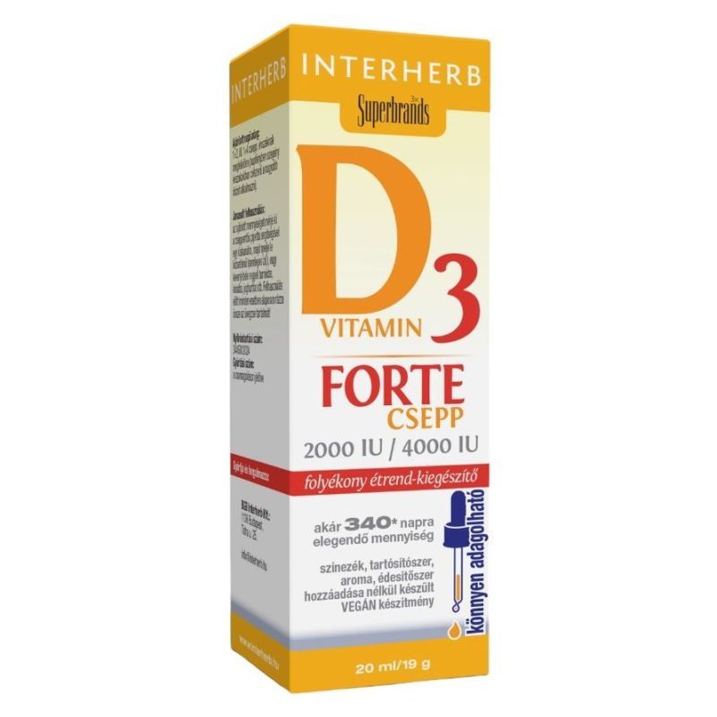 Az INTERHERB D3 Vitamin Forte Csepp egy praktikus pipettás kupakkal ellátott, semleges ízű készítmény, amely akár 340 napra elegendő mennyiséget biztosít. A termék hozzájárulhat az immunrendszer megfelelő működéséhez, az egészséges csontozat és fogazat fenntartásához, valamint a kalcium és foszfor hasznosulásához. A készítmény vegán, és nem tartalmaz színezéket, tartósítószert, aromát vagy édesítőszert. Az ajánlott napi adag 1×2 vagy 1×4 csepp, évszaktól függően. A termék használata előtt alaposan rázza fel az üveg tartalmát, és a cseppeket közvetlenül nyelje le, vagy keverje bele reggeli turmixba, kásába, joghurtba.