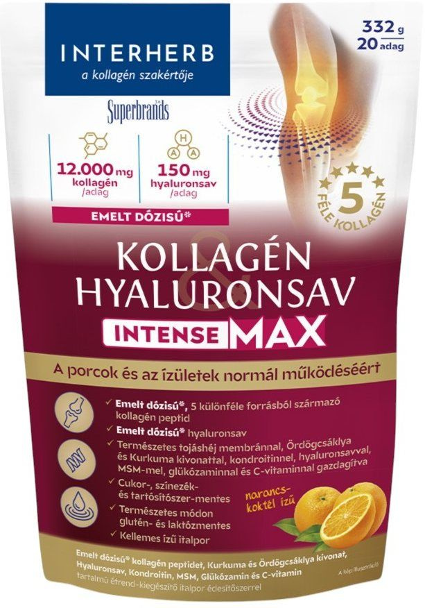 Az INTERHERB Intense-Max narancs ízű italpor célzott hatóanyag-kombinációja a porcok és ízületek védelmére készült. Kiemelkedően magas kollagén-tartalma mellett hialuronsavat, glükózamint, MSM-et és kondroitin-szulfátot tartalmaz. A C-vitamin segítheti a normál kollagénképződést, míg a kurkuma és az ördögcsáklya kivonat további támogató szerepet tölthet be. Kellemes narancs ízesítése révén könnyen beilleszthető a napi étrendbe, kúraszerű fogyasztása hozzájárulhat a mozgásszervi komfortérzet fenntartásához.