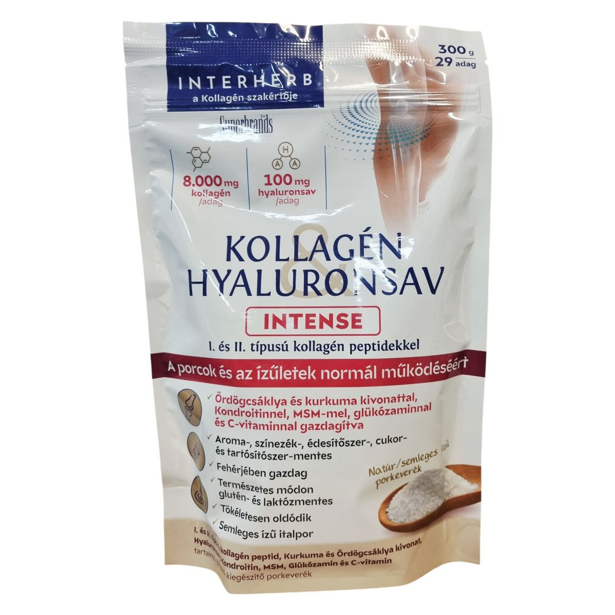 Az izületek rugalmassága és teherbíró képessége a kor előrehaladtával csökkenhet, ami befolyásolhatja a mindennapi életvitelt, különösen fokozott fizikai aktivitás vagy sport esetén. Ezért szervezetünknek és izületeinknek több építőelemre lehet szüksége. Az Interherb Kollagén Hyaluronsav Intense porkeverék jól oldódó, semleges ízű és nagydózisban tartalmazza az izületek természetes alkotóelemeit. A kurkuma és az ördögcsáklya standardizált kivonatai hozzájárulhatnak az izületek mozgékonyságának és rugalmasságának megőrzéséhez. A benne található I. típusú kollagén a bőr, csontok, inak és szalagok nélkülözhetetlen vázanyaga, míg a II. típusú kollagén az izületek és porcok építőköve. A hyaluronsav nagy vízmegkötő képessége révén elsősorban az izületi folyadék megtartásában játszhat szerepet. A C-vitamin hozzájárulhat a normál kollagénképződéshez, ezáltal a porcok és csontok megfelelő állapotának fenntartásához, míg a kondroitin, MSM és glükózamin a porcszövetek és izületek természetes alkotóelemei lehetnek. A termék cukor-, édesítőszer-, aroma-, színezék- és tartósítószer-mentes, természetes módon glutén- és laktózmentes, így sokféle étrendi igényhez illeszthető. Fogyasztása 2-3 hónapos kúrában javasolt, ezt követően 2 hét szünet ajánlott.