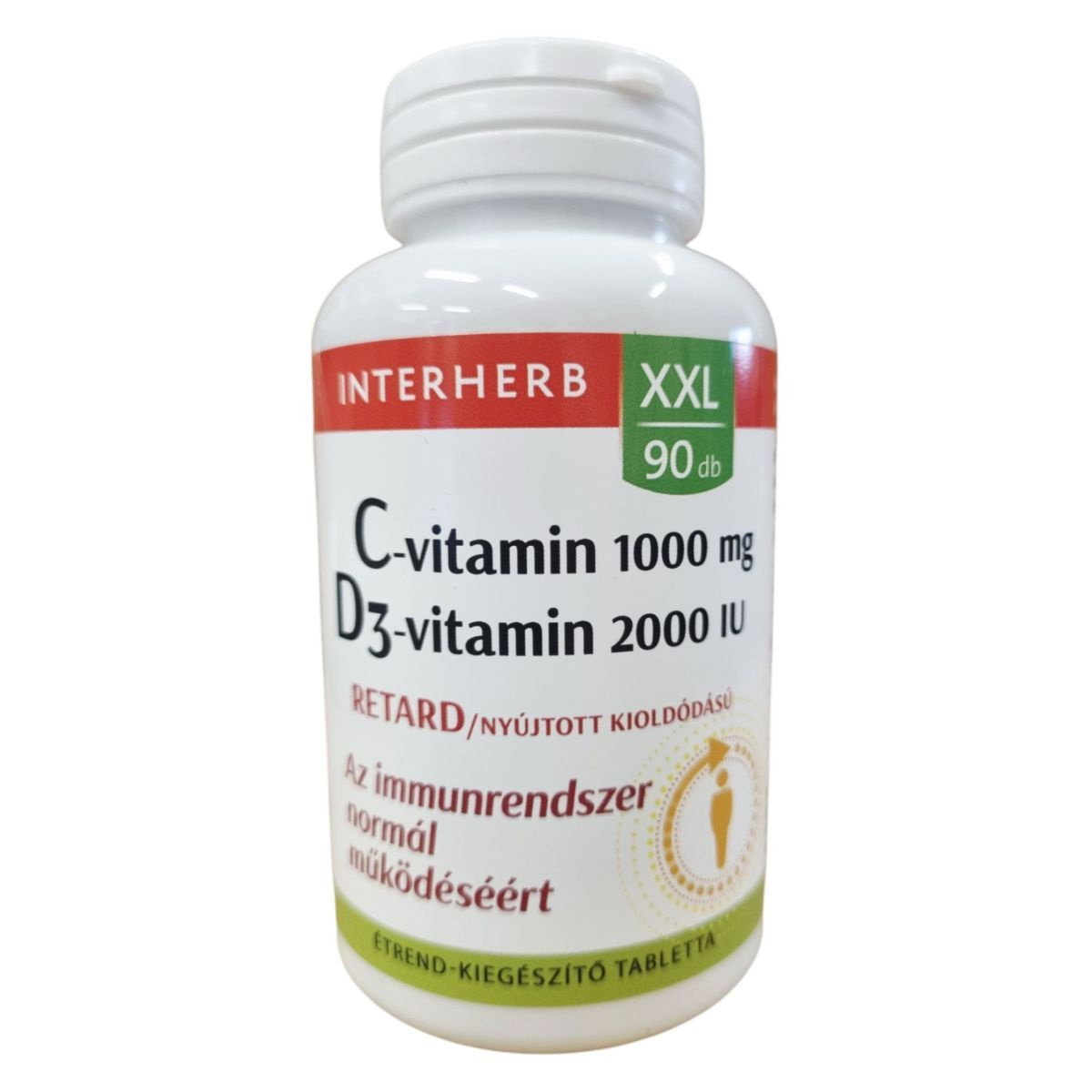 Az INTERHERB XXL étrend-kiegészítő tabletta nagydózisú C- és D3-vitamint tartalmaz, amelyek nyújtott kioldódású formulája hozzájárulhat a szervezet kiegyensúlyozott vitaminellátásához. A C-vitamin segíthet az immunrendszer normál működésében, a sejtek oxidatív stresszel szembeni védelmében, valamint a fáradtság csökkentésében. A D-vitamin támogathatja az egészséges csontozat és fogazat fenntartását, valamint a kalcium és foszfor hasznosulását. A termék fogyasztása nem helyettesíti a kiegyensúlyozott étrendet és az egészséges életmódot.