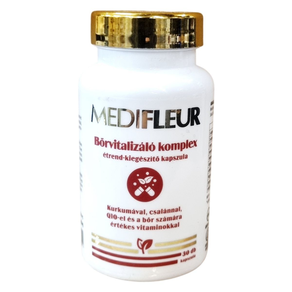 A Medifleur bőrvitalizáló komplex étrend-kiegészítő kapszula rendszeres használat esetén hozzájárulhat a bőr egészségének megőrzéséhez. A benne található szelén segítheti a sejtek oxidatív stresszel szembeni védelmét, míg a kurkuma és a berberin kivonat támogatást nyújthat a bőr egészségének megőrzésében. A koenzim Q10 antioxidáns hatású, és elősegítheti a szabad gyökök elleni védelmet, amelyek főként a bőr öregedéséért felelősek lehetnek. Ezen túlmenően az E-vitamin fontos szerepet játszhat az egészséges bőr fenntartásában. A készítmény cukormentes, színezék- és tartósítószer-mentes, GMO-mentes és teljes mértékben vegán, ezáltal széles körben alkalmazható a különböző étrendi igényekhez igazodva. A csomagolás 30 napi adag kapszulát tartalmaz, amelyet száraz és hűvös helyen ajánlott tárolni.