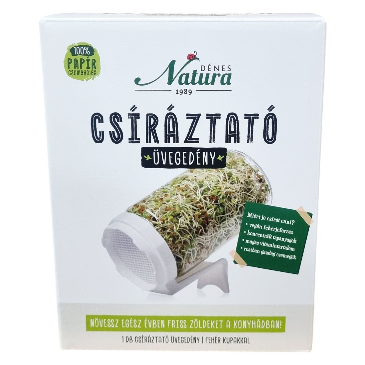 A Dénes Natura 1989 csíráztató üvegedény fehér kupakkal ideális eszköz friss zöldek termesztéséhez egész évben a konyhában. A csírák vegán fehérjeforrást és rostban gazdag, magas vitamintartalmú finomságokat kínálnak, melyek táplálóak és változatosak. A csíráztatás során fontos a magok beáztatása és rendszeres, naponta kétszeri átöblítés. Friss vegyes csírasaláta készítéséhez a lencsecsíra ajánlott alapnak, melyhez sokféle csíra és apróra vágott zöldség adható, és ízlés szerint olívaolajjal, citromlével, sóval, agávé sziruppal vagy fűszerezett joghurttal ízesíthető.