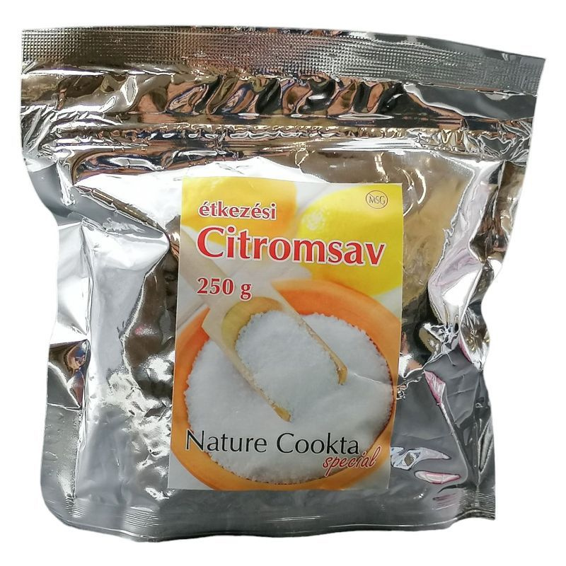 Nature Cookta citromsav: összetételét tekintve garantáltan nátrium-glutamát mentes, és anhidrát, vagyis teljes mértékben vízmentes. Ennek a tulajdonságának köszönhető, hogy a csomagolásban kevésbé tapad össze nedvesség hatására: adagolása, kezelése könnyebbé válik. A gyártó mind gyártási technológiájában, mind pedig alapanyagát tekintve elzárkózik a génmanipulációtól. A fehér, kristályos por kinézetében nagyon hasonlít az aszkorbinsavhoz, és kémiai tulajdonságaikban is csak abban különböznek, hogy az aszkorbinsav eggyel kevesebb oxigénatomot tartalmaz. Bár önmagában nincsen antioxidáns hatása, ezek hatásait mégis felerősíti, hatékonyabban tudnak védekezni a szabadgyökökkel szemben, így mindenféleképpen jó hatású szervezetünkre. A Nature Cookta citromsav teljesen természetes, megtaláljuk nagyon sok gyümölcsben, főképp a citrusfélékben és a bogyós gyümölcsökben, bár a fekete áfonya kivételt képez ez alól. Természetes mivoltán kívül mindennapjaink során is számtalan alkalommal találkozunk vele, sok ételünk szerves alkotórésze.