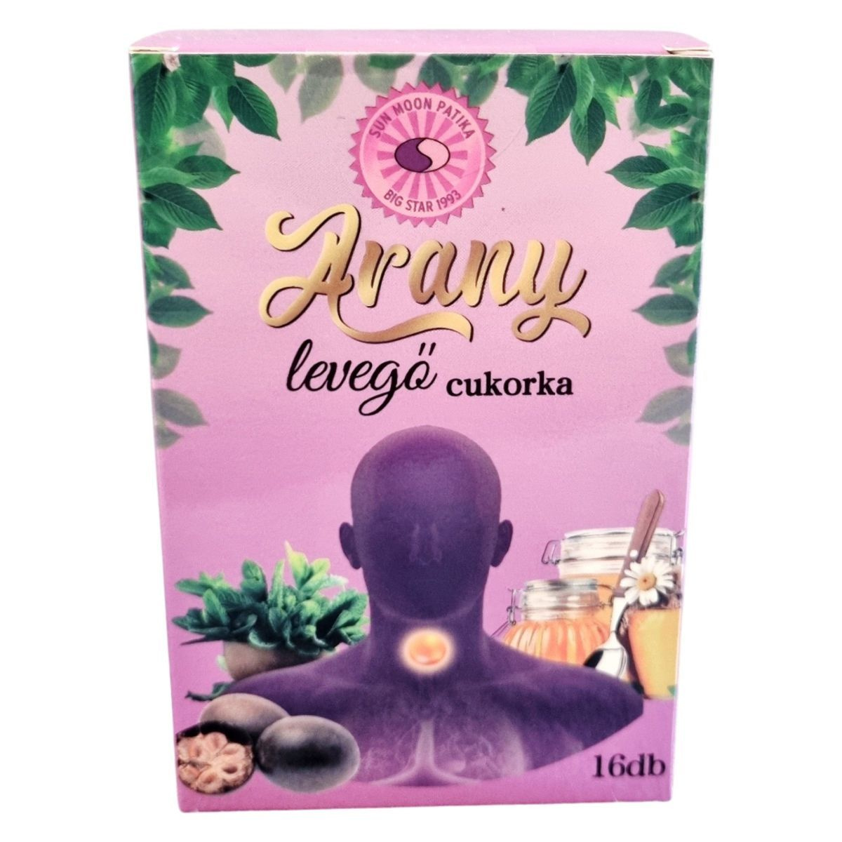 Az Arany levegő torokcukorka egy különleges termék, amely 16 darab cukorkát tartalmaz. A termék összetevői között megtalálható a szerzetesek körtéje kivonat, borsmenta olaj, mentol, méz és nádcukor. A termék alkalmazása során javasolt, hogy egyszerre csak egy cukorkát fogyasszunk, és naponta ne lépjük túl az 5 darabos mennyiséget. A termék fogyasztása nem ajánlott csecsemők, kisgyermekek, szoptató és terhes kismamák számára. A cukorkákat szobahőmérsékleten érdemes tárolni. A termék Kínából származik, és a Big Star Street Kft. forgalmazza.