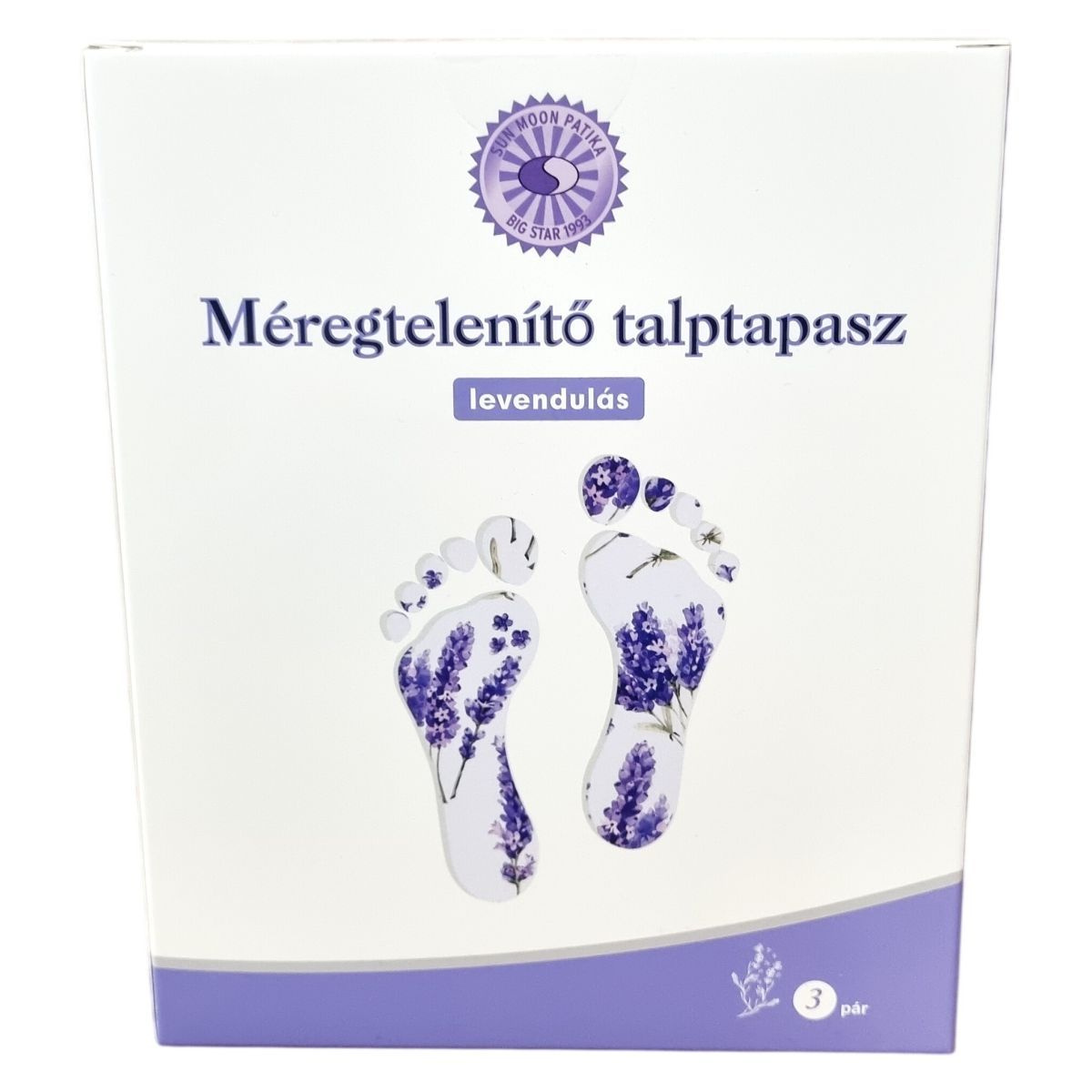 A méregtelenítő talptapasz levendulás változatban, 3 páros kiszerelésben érhető el. A termék használata során a talp bőrére helyezve fejti ki hatását, amely akár 8-10 órán át is hatékony marad. Összetételében bambuszecet, faecet, kitozán, turmalin, C-vitamin és dextrin található, melyek támogatják a méregtelenítést. A termék kizárólag külső használatra készült, és nem ajánlott sérült bőrfelületen vagy terhes nők számára. A csomagoláson feltüntetett határidőig megőrzi minőségét. Származási helye Kína.