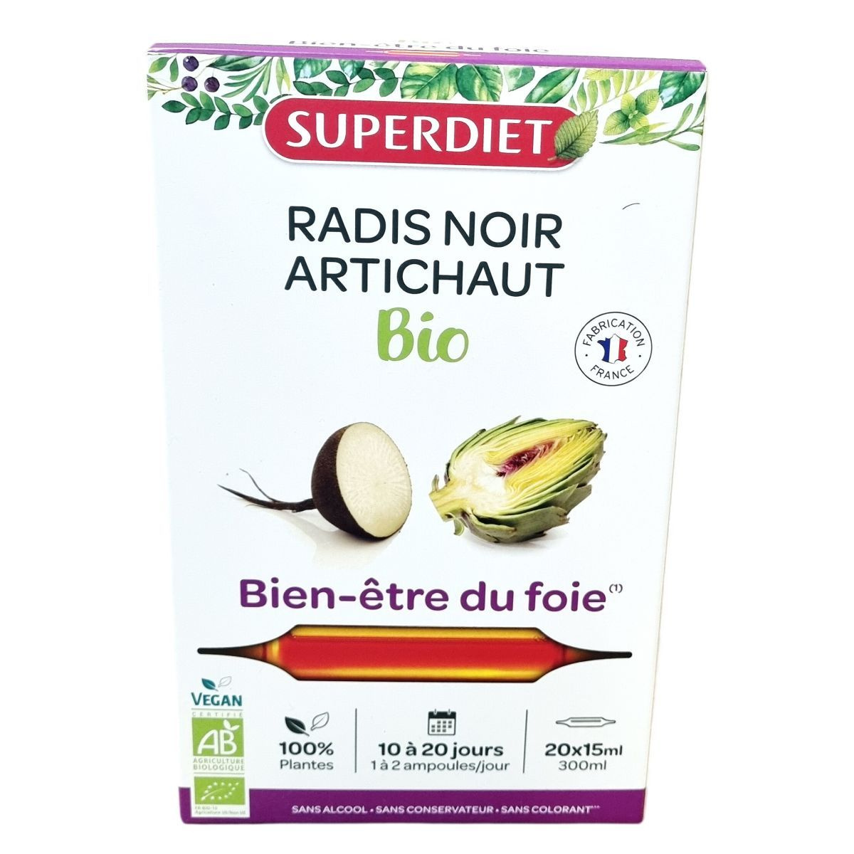 A termék fekete retekből és articsókából készült bio növényi koncentrátum, melynek alapanyagai Észak-Franciaországban, a gyártó közelében termesztett és hidegen sajtolt fekete retek, valamint levél- és száraz kivonat formában használt articsóka. A hidegsajtolásos módszer több mint 60 éves tapasztalatot tükröz. A formula nem tartalmaz alkoholt, tartósítószert és színezőanyagot, az összetevők mind biogazdálkodásból származnak. A termék használata javasolt felnőtt férfiaknak, nőknek és 12 éves kortól serdülőknek, különösen májvédelmi célból. Az ampullák könnyen nyithatóak, és használat előtt fel kell rázni őket. A termék kizárólag orális alkalmazásra készült, nem alkalmas injekciós beadásra. A precíz adagolás betartása és az egészséges életmód fenntartása ajánlott a készítmény alkalmazása mellett.