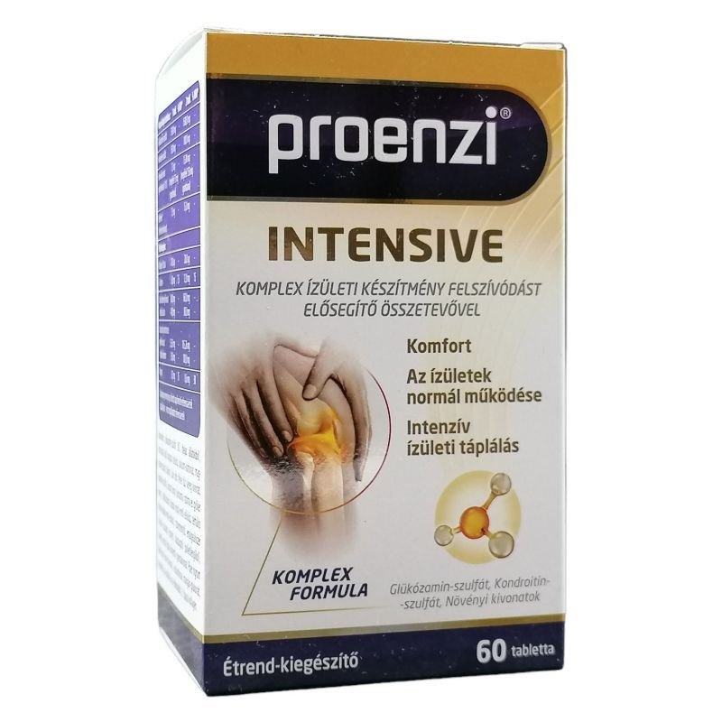 A Proenzi INTENSIVE egy komplex ízületi készítmény, amelyet az ízületek táplálására és a vázizomrendszer támogatására fejlesztettek ki. A termék glükózamin-szulfátot, kondroitin-szulfátot és II. típusú kollagént tartalmaz, amelyek hozzájárulhatnak az ízületi porcok normál állapotának fenntartásához. A C-vitamin segíthet a normál kollagénképződésben, míg a mangán a kötőszövet-képződésben játszhat szerepet. A termékben található BioPerine fokozhatja az összetevők felszívódását. A Salix alba és Curcuma longa kivonatok a népgyógyászatban és az ayurvédában is ismertek lehetnek az ízületek egészségének megőrzésében. A termék használata során fontos a kiegyensúlyozott étrend és az egészséges életmód fenntartása.